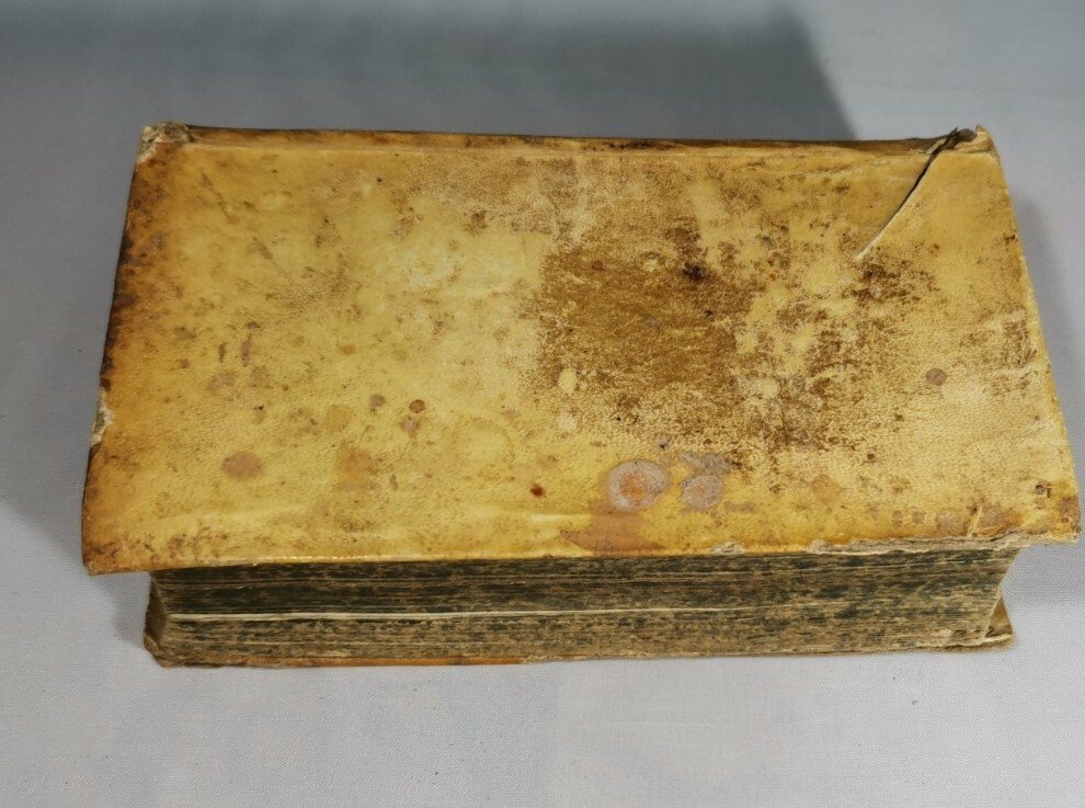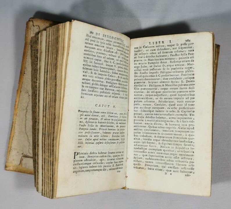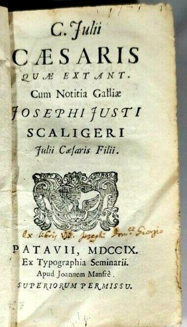 C. Julii Caesaris quae extant cum notitia Galliae di Josephi Justi Scaligeri (Giuseppe Giusto Scaligero o della Scala) Julii Caesaris Filii. Patavii (Padova) ex typhographia seminarii apud Joannem Manfrè, 1709. (VI) + 686 + (67) pagine. Copertina in tutta pergamena con titoli manoscritti al dorso. Dimensioni: 9 x 17 cm.stato di conservazione: buono (fioriture, antica firma di appartenenza, legatura allentata, piccola mancanza al piatto anteriore e al margine inferiore del dorso) Joseph Justus Scaliger, italianizzato in Giuseppe Giusto Scaligero (Agen, 5 agosto 1540 – Leida, 21 gennaio 1609), è stato uno storico, scrittore e umanista francese di origine italiana, inventore del giorno giuliano (da wikipedia)