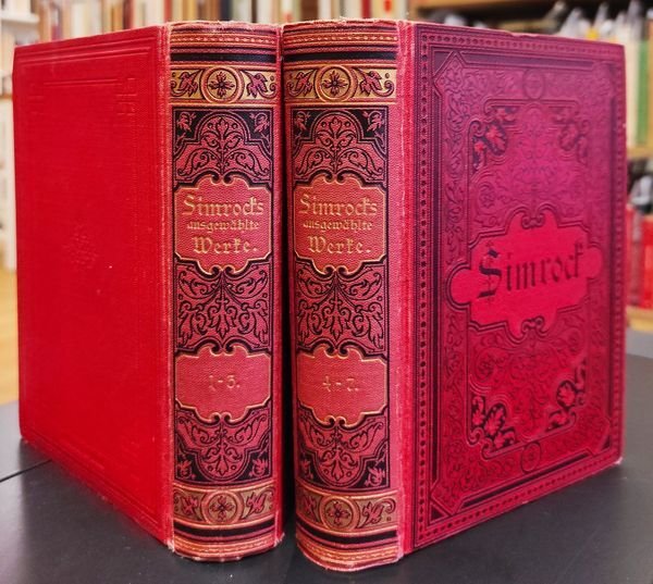 2 volumen in 16, Prächtige Verlags Bindung in rotem Leinen mit Golddruck und Verzierungen am Rücken und auf vorderem Deckel, marmorierter Schnitt, ein Portrait des Dichters in Band 1. Karl Joseph Simrock (1802-1876) war ein deutscher Dichter und Philologe. Molto buono (Very Good) .