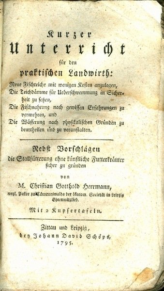 Kurzer Unterricht für den praktischen Landwirth: Neue Fischteiche mit wenigen Kosten anzulegen, die Teichdämme für Ueberschwemmung in Sicherheit zu setzen, die Fischnahrung nach gewissen Erfahrungen zu vermehren und die Wässerung nach physikalischen Gründen zu beurtheilen und zu veranstalten.