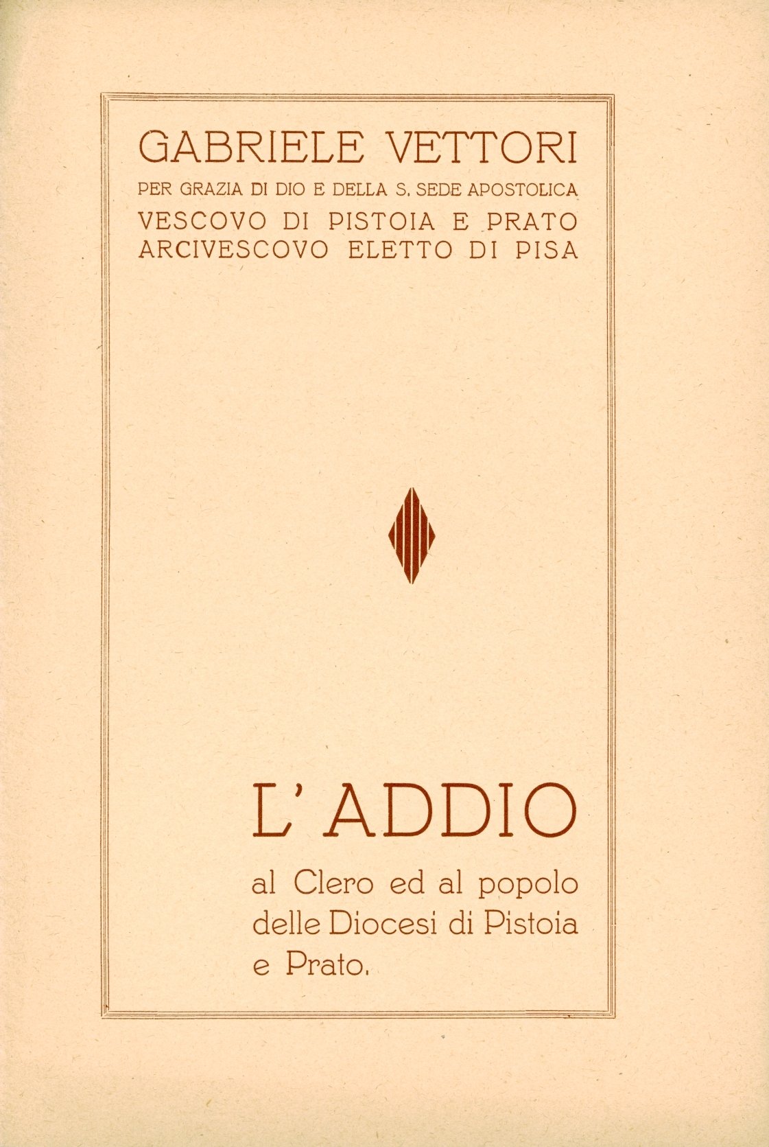 15 p. 21 cm. Saluto del vescovo di Pistoia e Prato eletto arcivescovo di Pisa. 200 - Ba Ottimo (Fine)