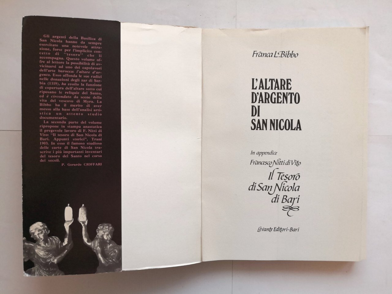 L'ALTARE D'ARGENTO DI SAN NICOLA di Franca L. Bibbo. In appendice - Il tesoro di San Nicola di Bari di Francesco Nitti di Vito. Editore Levante, 1987. 150 + 95 pagine, illustrazioni in bianco e nero fuori testo. Copertina editoriale in brossura. Stato di conservazione: molto buono (pagine normalmente ingiallite) Libro usato saggistica chiesa basilica Bari