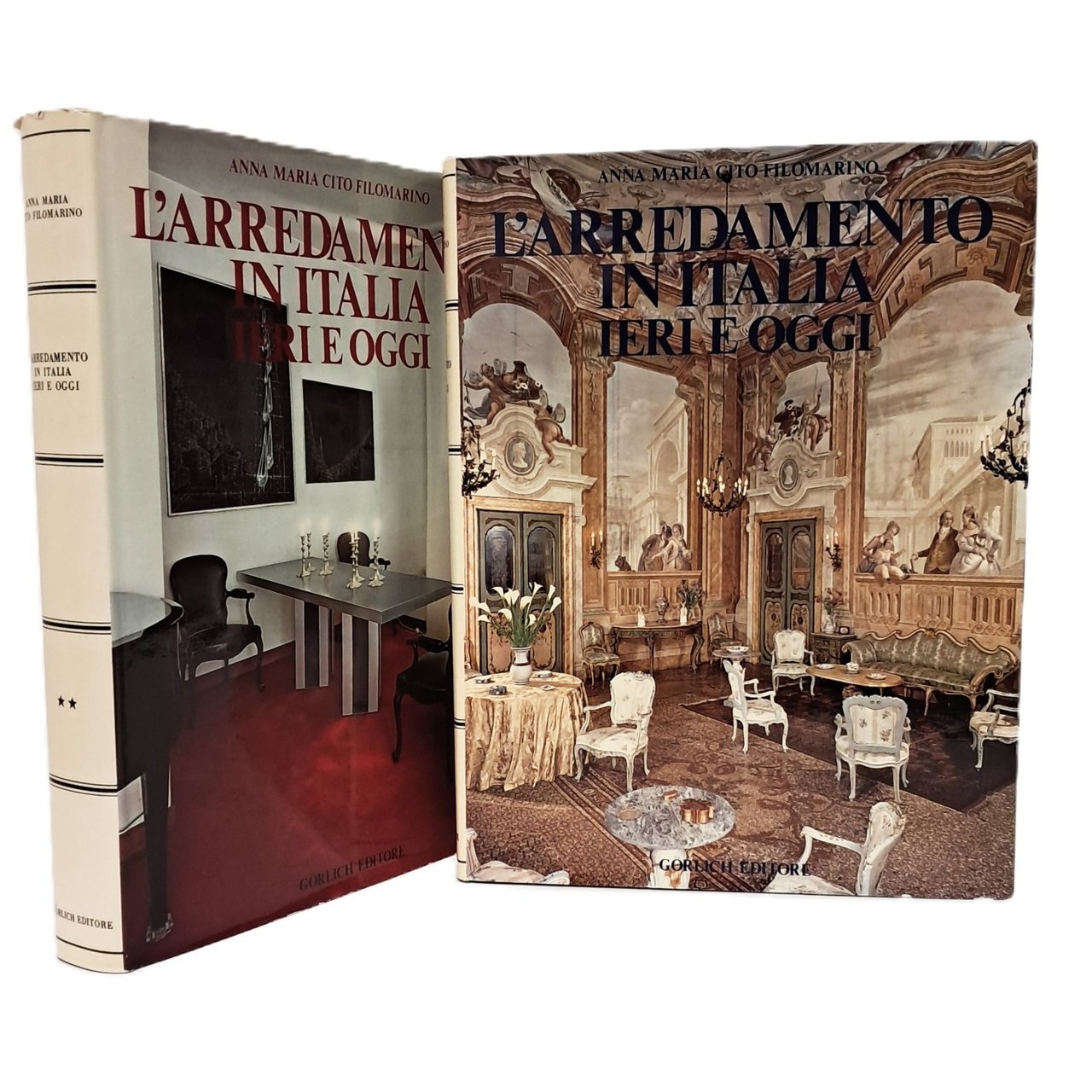 PRIMA EDIZIONE opera in due volumi Pubblicazione che esalta la grande tradizione dell'arredamento italiano guidando il lettore attraverso le porte di favolose dimore adottando una suddivisione per ambienti e accostando il mobile antico all'avanguardia delle dimore di leaders dell'economia, dell'arte e della cultura. Con 270 illustrazioni a colori e 116 in nero. Copertine cartonate con sovraccoperte illustrate in cofanetto. Pp. 248+261. Ottime condizioni, solo un minuscolo strappo alla sovraccoperta in basso sul retro del secondo volume.