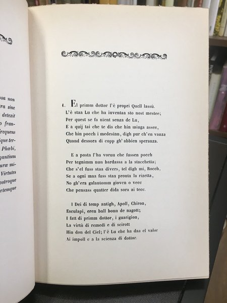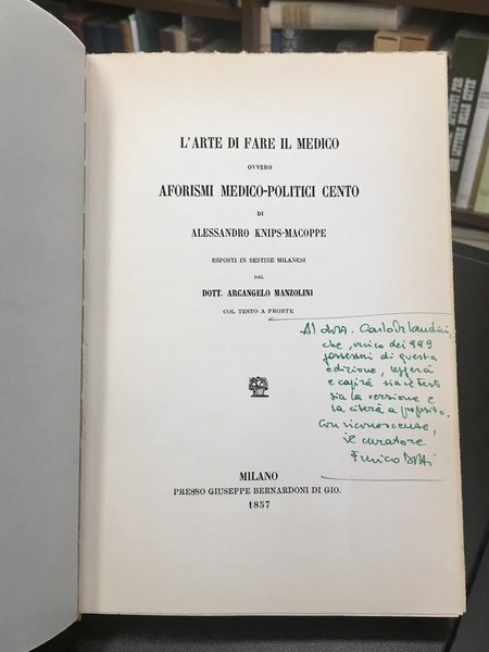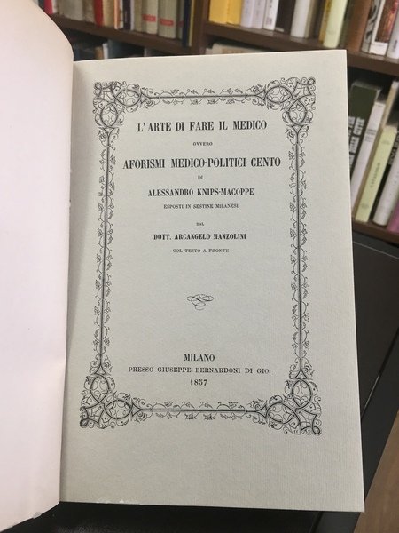 L'arte di fare il medico ovvero aforismi medico-politici cento di Alessandro Knips-Macoppe esposti in sestine milanesi dal Dott. Arcangelo Manzolini col testo a fronte.
