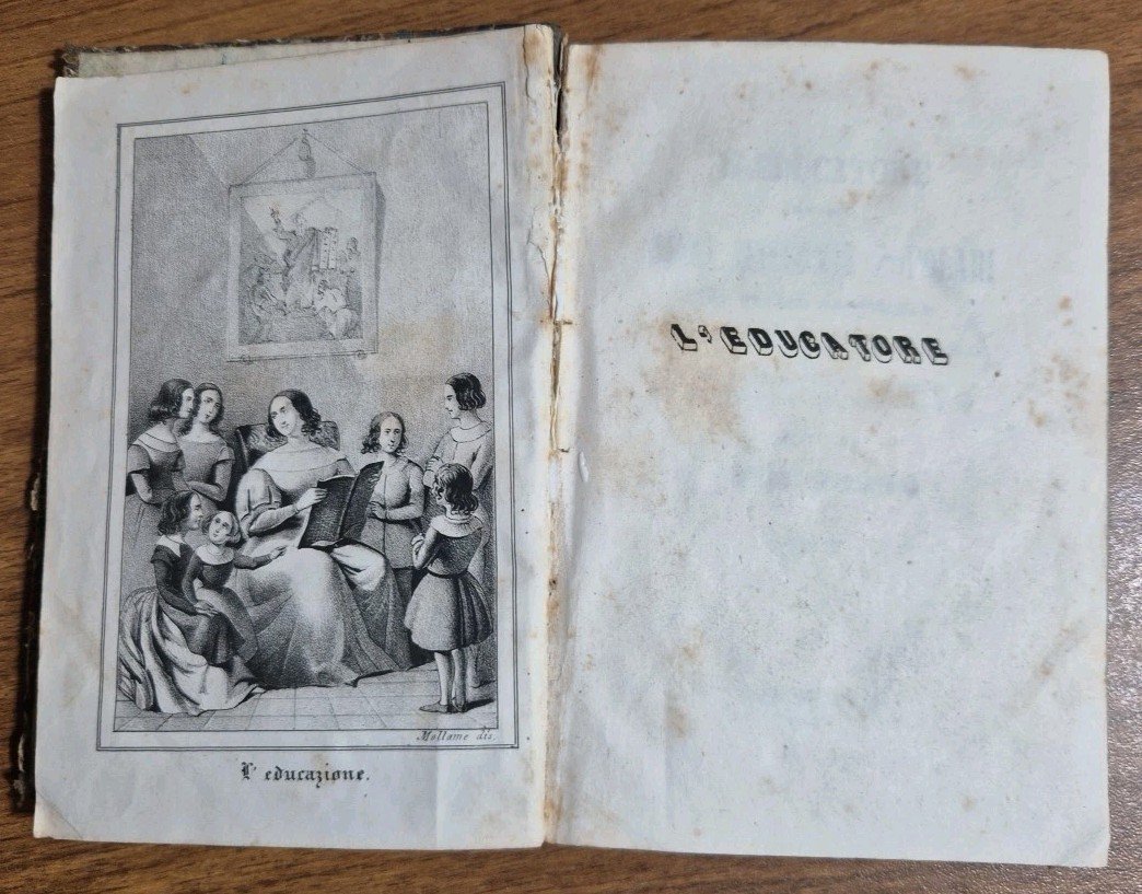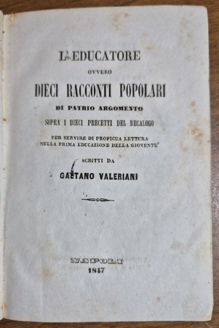 L’EDUCATORE OVVERO DIECI RACCONTI POPOLARI di patio argomento sopra i dieci precetti del decalogo per servire di proficua lettura nella prima educazione della gioventù scritti da Gaetano Valeriani. Napoli, tipografia Cannavacciuoli, 1847.. XIII, 354 pagine, una bella incisione in antiporta. Copertina coeva in mezza pelle. Dimensioni : 10 x 15 cm. Stato di conservazione : buono (fioriture , legatura un po’ allentata , copertina sciupata con piccole mancanze al dorso, pasticcetti a penna alle guardie). Libro usato saggistica