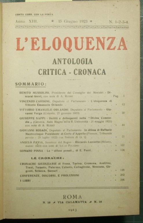 L'eloquenza - Anno XIII - 15 Giugno 1923/31 Marzo 1924- NN. 1/16 - 20 Marzo 1923 - NN. 17/20