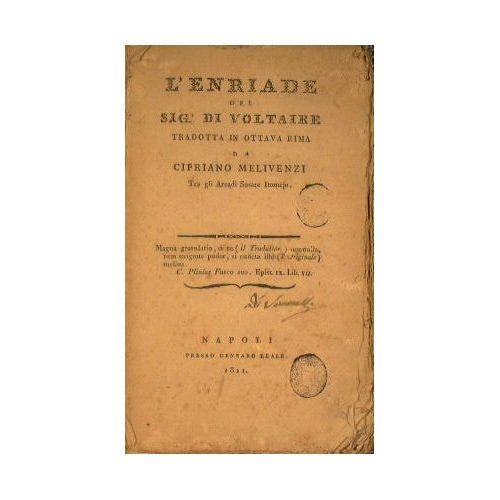 Tradotta in ottava rima da Cipriano Melivenzi Tra gli Arcadi Sosare Iromejo - in 8° - pp.188 - - Manca la copertina. Volume completamente slegato.