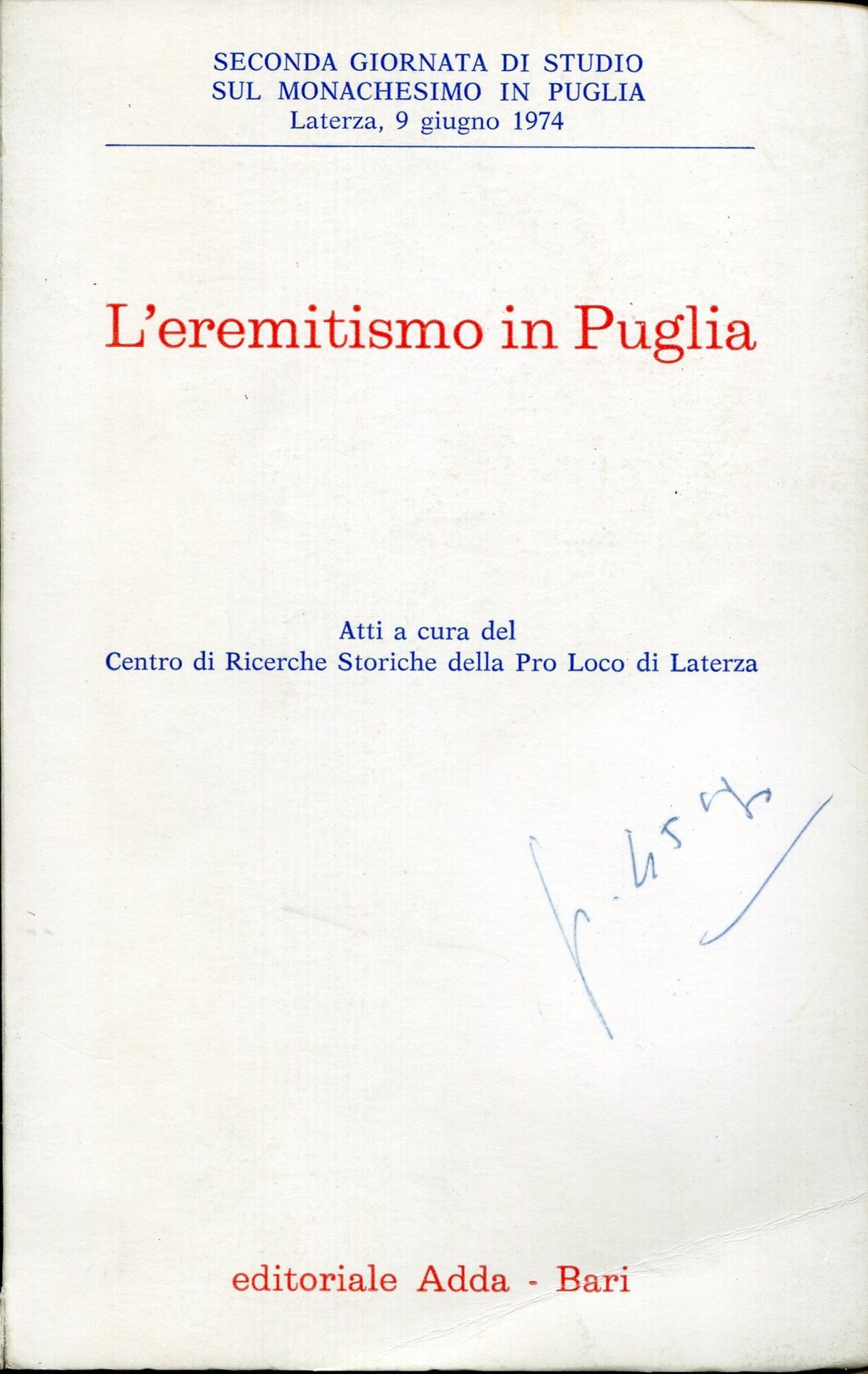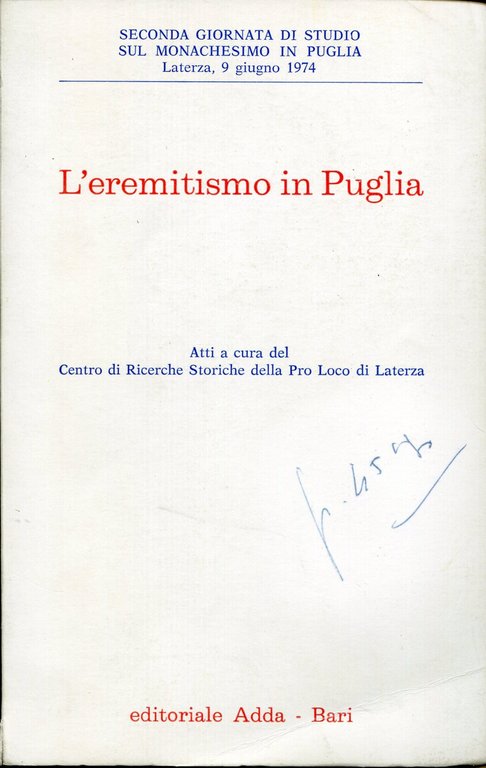 101 p., [8] p. di tav. : ill. ; 20 cm, brossura, annotazione con penna alla copertina come da immagine, altrimenti ottimo. Giornata di studio sul monachesimo in Puglia. Centro di ricerche storiche della Pro Loco Buono (Good) .