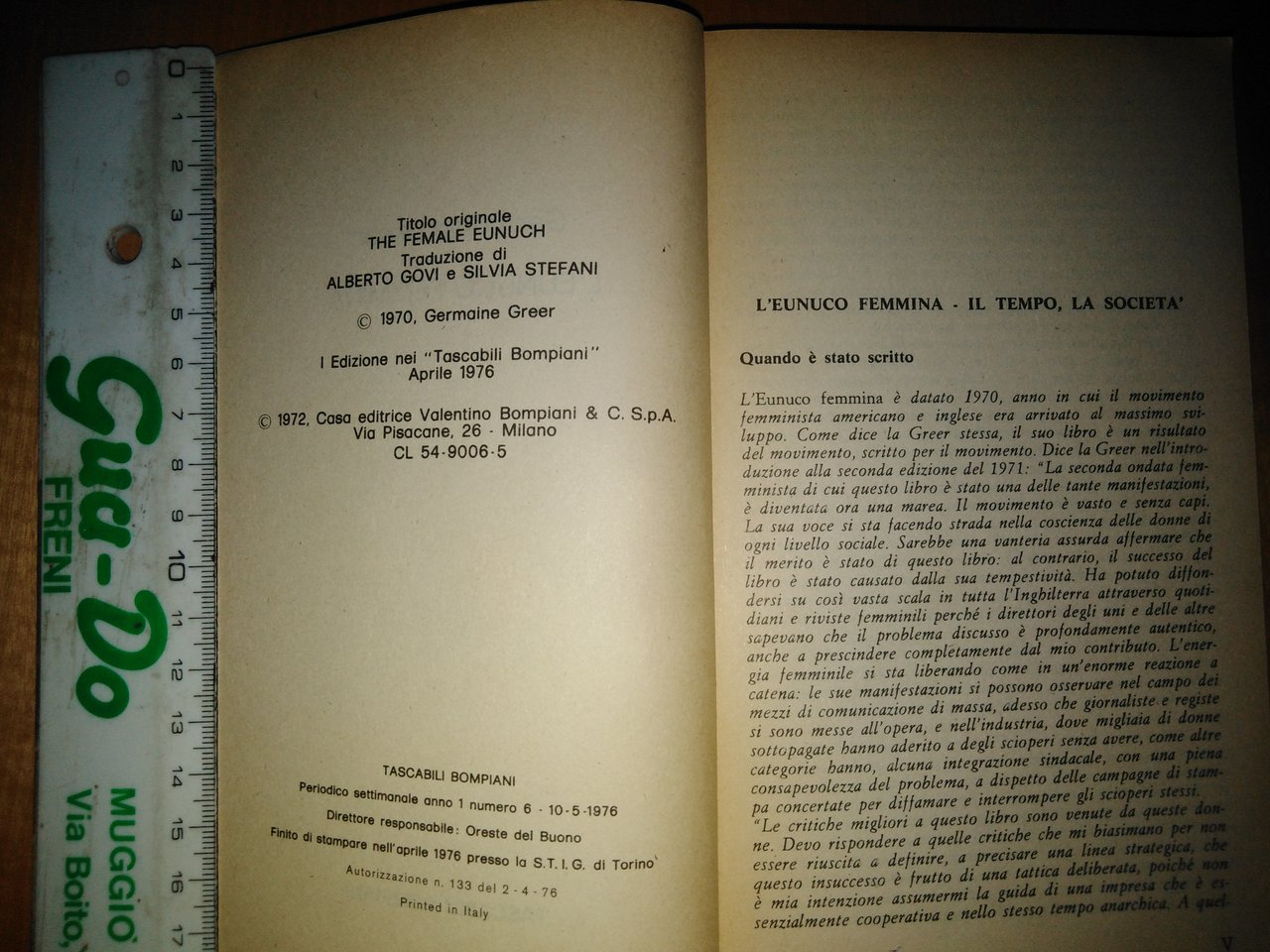GERMAINE GREER, L'EUNUCO FEMMINA. LA DONNA ALLA RICERCA DELL'IDENTITà PERDUTA - Bompiani, I ed. 1976