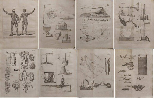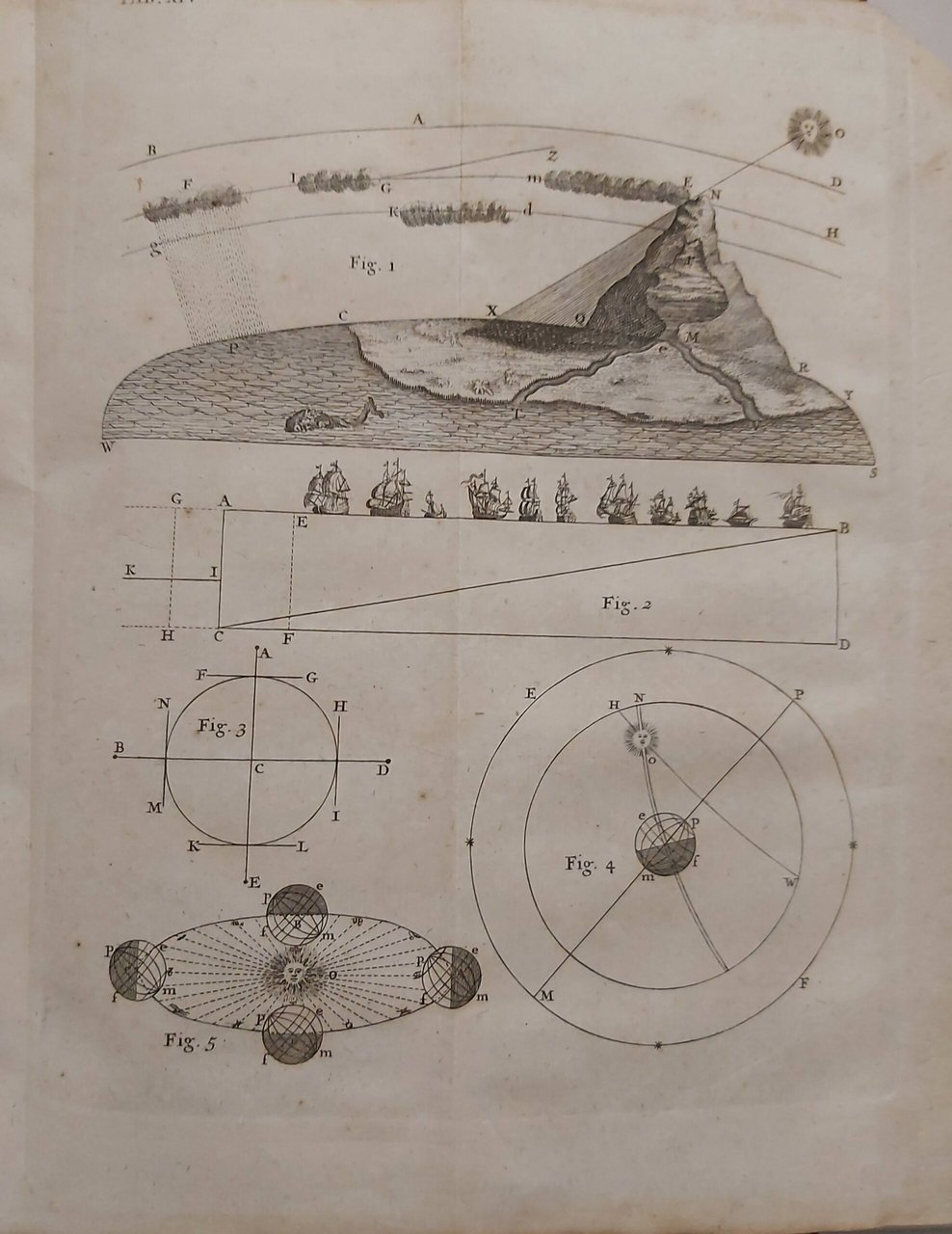 in-4 gr., pp. (16), 584, (12), leg. cart. rust. coevo con tit. mss al d. Antip. inc. in rame. Ritr. dell’A. a pag. 1 inc. in rame da Gunst su dis. di Walchenburg. Con 28 tavv. ripp. al fine raff. esperimenti di fisica, tavv. astronomiche, farfalle, pesci, etc. Esempl. con legg. brun. unif. dovuta alla qualità della carta. Le tavv. sono legate con sequenza errata. Larghi margini.