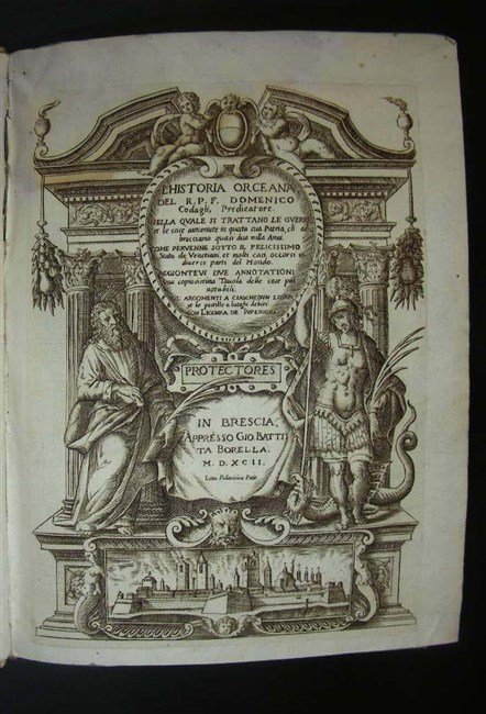 L'HISTORIA OCEANA del R.T.F…. Predicatore. Nella quale si trattano le guerre et le cose avvenute in questa sua patria, ch'abbracciano quasi due milla anni. Come pervenne sotto il felicissimo Stato dei Venetiani, et molti casi occorsi in diverse parti del mondo. Aggiuntevi due Annotationi. Brescia, appresso Gio. Battista Borella, 1592. Segue: Le due Annotationi aggionte all'Historia Orceana dall'istesso Rev. Autore.Nelle quali per modo d'epilogo e d'un breve ritratto si raccogliono forsi dugento a quaranta sette gentiluomini che hebbero il governo di questa sua Patria.