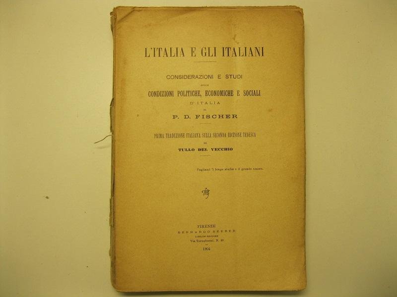 L'Italia e gli italiani. Considerazioni e studi sulle condizioni politiche, economiche e sociali d'Italia di P. D. Fischer Prima traduzione italiana sulla seconda edizione tedesca di Tulli del Vecchio