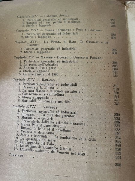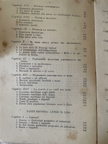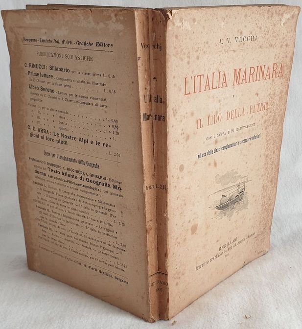 Edizione del 1905 di questo interessante volume sull'Italia marinara di A. V. Vecchi ad uso delle scuole. Mappa in antiporta: Italia subacquea, dei fari e delle comunicazioni sottomarine. Numerose illustraazioni all'interno tra cui: Nisida, Livorno, La Spezia, vari tipi di rete ed attrezzature marine e da pesca, Noli, Ventimiglia, Genova, Civitavecchia, Nisida, Amalfi, Palermo, Messina, Taranto, Bari, Venezia ecc. All'interno: L'Italia nel Mediterraneo, Il mare italiano, Il mare veicolo di ricchezze e informazioni, Prodotti commerciali del mare, La notte e il mare, Naviglio commerciale, Naviglio peschereccio militare, da diporto, Il mare nella storia dei risorgimento nazionale, Professioni marittime, Professioni rinumerative in mare, Liguria, Toscana, Lazio, Gaeta e le Isole Pontine, Golfo di Napoli, SArdegna ed isole adiacenti, Principato Cilento Calabria Tirrena, Isole Eolie, Sicilia, Ustica Egadi Pantelleria Lampedusa, Calabria Jonica, Terra d'Otranto e Puglia Leccese, La Puglia di Bari il Gargano e le Tremiti, MArche Ducato d'Urbino e Pesaro, Romagna, Veneto In buone condizioni. Copertina editoriale in discrete condizioni generali con usure ai margini e dorso. Legatura in discrete condizioni con rotture. Pagine in buone condizioni con fioriture. In 8 cm 20x13,5. Pp. 359. Peso Kg. 0,350 Edition of 1905 of this interesting volume about sea Italy by A. V. Vecchi for the usage of schools. Map in the frontspice: underwater Italy, submarine communications. Different illustrations inside between them: Nisida, Livorno, La Spezia, vari tipi di rete ed attrezzature marine e da pesca, Noli, Ventimiglia, Genova, Civitavecchia, Nisida, Amalfi, Palermo, Messina, Taranto, Bari, Venezia ecc. Inside: Italy i Mditerranean, Italian sea, Sea vehicle of richnesses and information, Trade products of the sea, the night and the sea, Commercial boat, Military fish ship, Sea in risorgimento nazional, Sea professions, Liguria, Toscana, Lazio, Gaeta e le Isole Pontine, Golfo di Napoli, SArdegna ed isole adiacenti, Principato Cilento Calabria Tirrena, Isole Eolie, Sicilia, Ustica Egadi Pantelleria Lampedusa, Calabria Jonica, Terra d'Otranto e Puglia Leccese, La Puglia di Bari il Gargano e le Tremiti, MArche Ducato d'Urbino e Pesaro, Romagna, Veneto In good conditions. Editorial cover in fair general conditions lightly worn in the extremities. Binding in fair conditions with cracks. Pages are in good conditions with foxing. In 8 cm 20x13,5. Pp. 359. Peso Kg. 0,350.