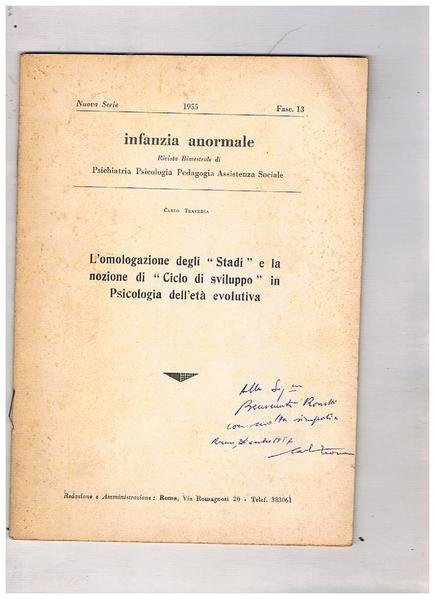 L'omologazione degli "Stadi" e la nozione di "Ciclo di sviluppo" in psicologia dell'età evolutiva. Fasc. n° 13 del 1955 della rivista bimestrale infanzia anormale.
