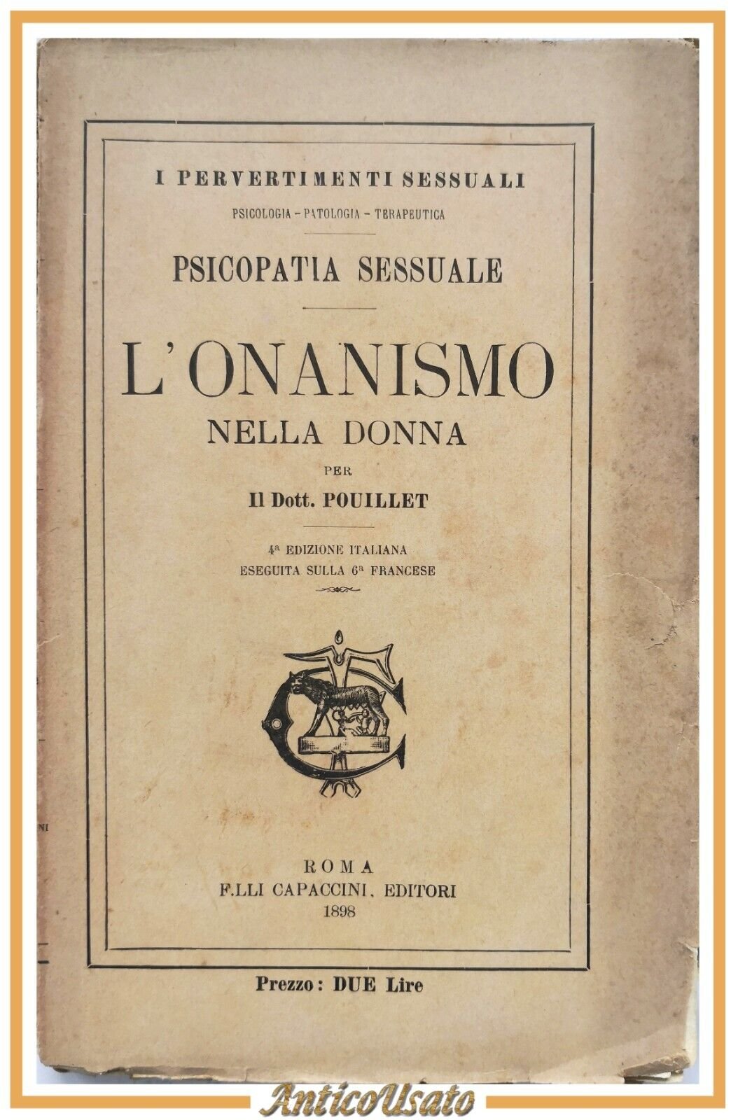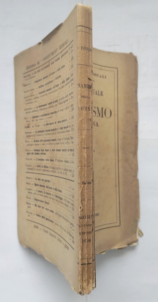 Roma, Fratelli Capaccini, 1898. Collana "I pervertimenti sessuali. Psicologia - Patologia - Terapeutica". 196 pagine. Copertina editoriale in brossura. Stato di conservazione: buono (pagine ingiallite, fioriture, copertina un po' sciupata) Libro antico psicologia