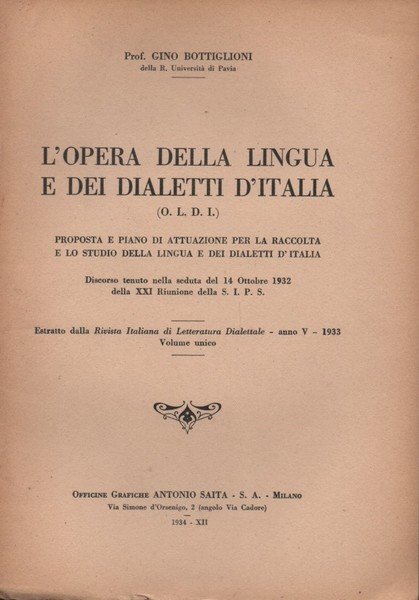 L'opera della lingua e dei dialetti d'Italia (O.L.D.I.). Proposta e piano di attuazione per la raccolta e lo studio della lingua e dei dialetti d'Italia. Discorso tenuto nella seduta del 14 Ottobre 1932 della XXI Riunione della S. I . P. S.