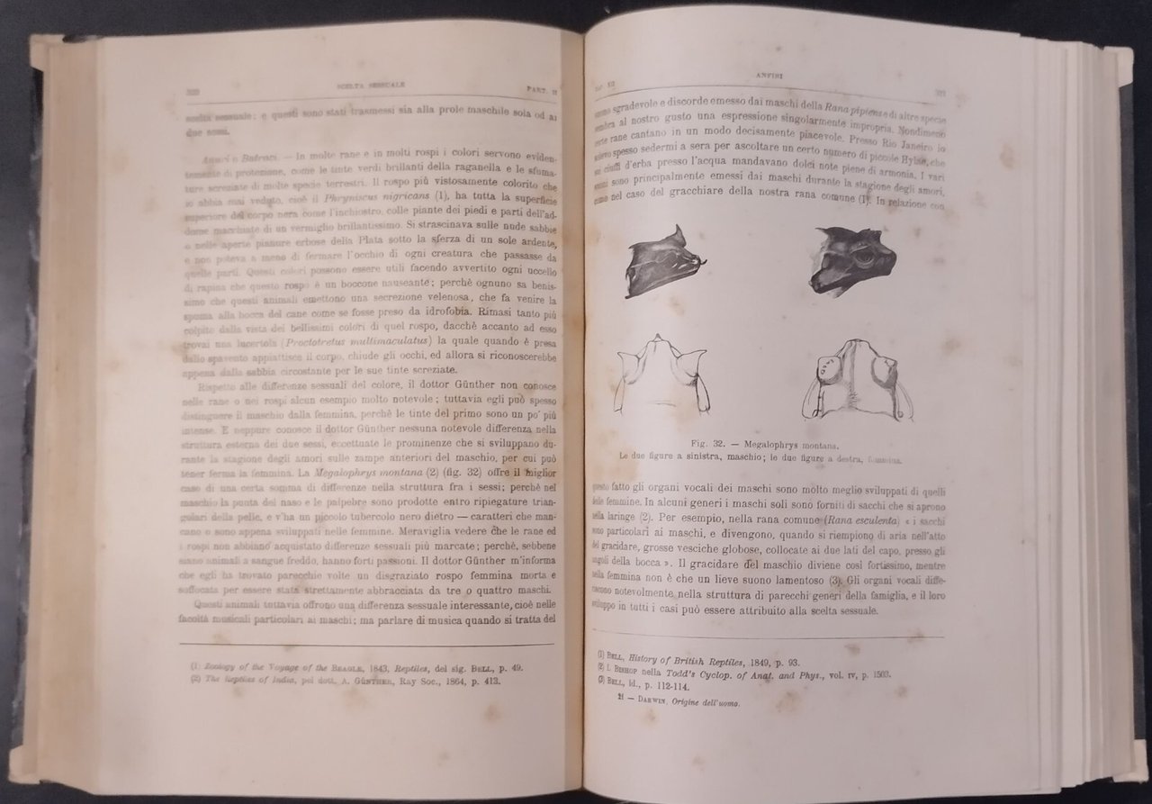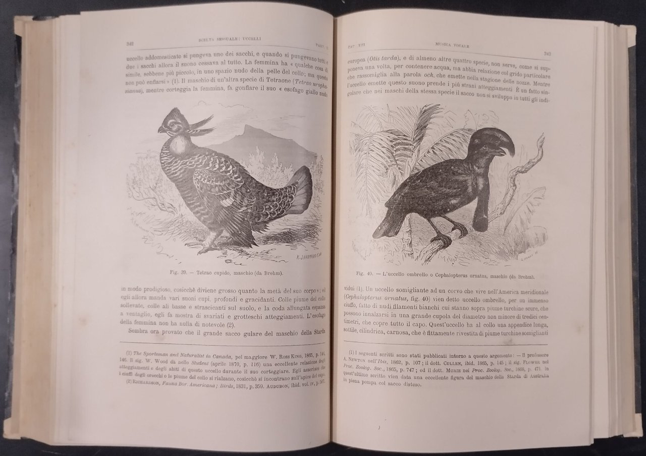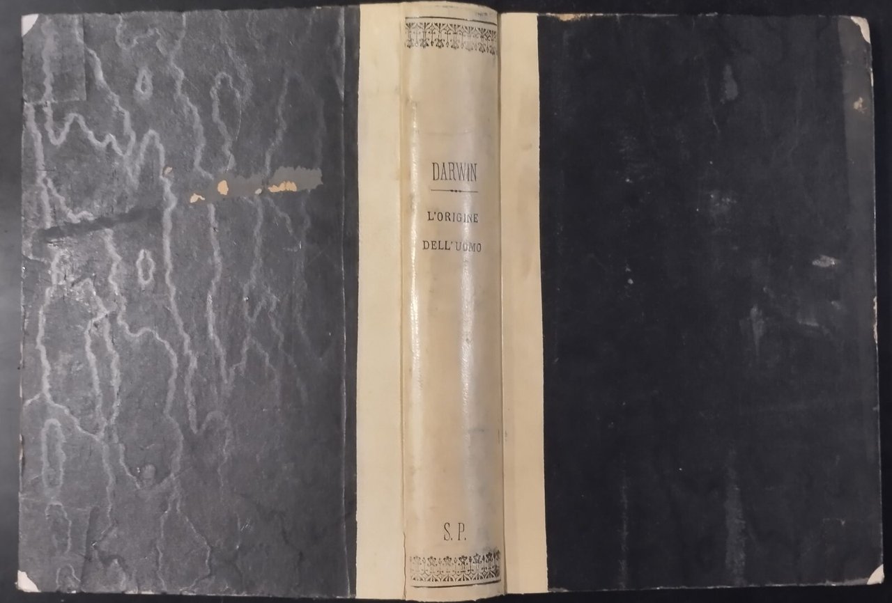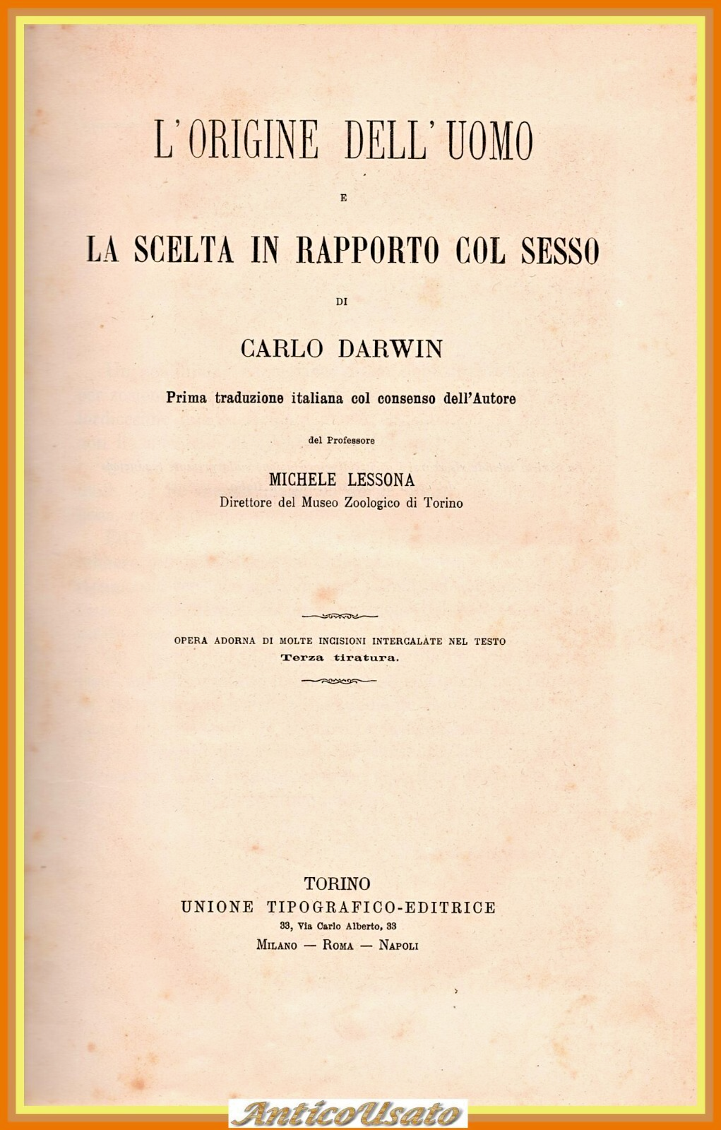 L'ORIGINE DELL'UOMO E LA SCELTA IN RAPPORTO COL SESSO di Carlo Darwin Prima traduzione italiana col consenso dell'autore di Michele Lessona.Torino , Unione tipografico Editrice, 1871. 671 pagine, numerose illustrazioni in bianco e nero nel testo. Copertina editoriale in mezza pergamena. Dimensioni: 18,5 x 26 cm. Stato di conservazione: molto buono (pagine normalmente ingiallite) Libro usato saggistica