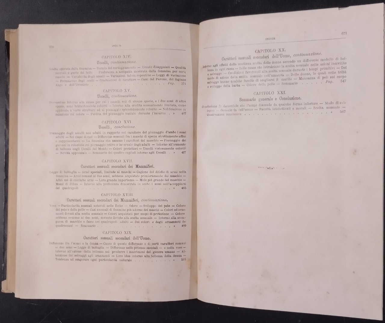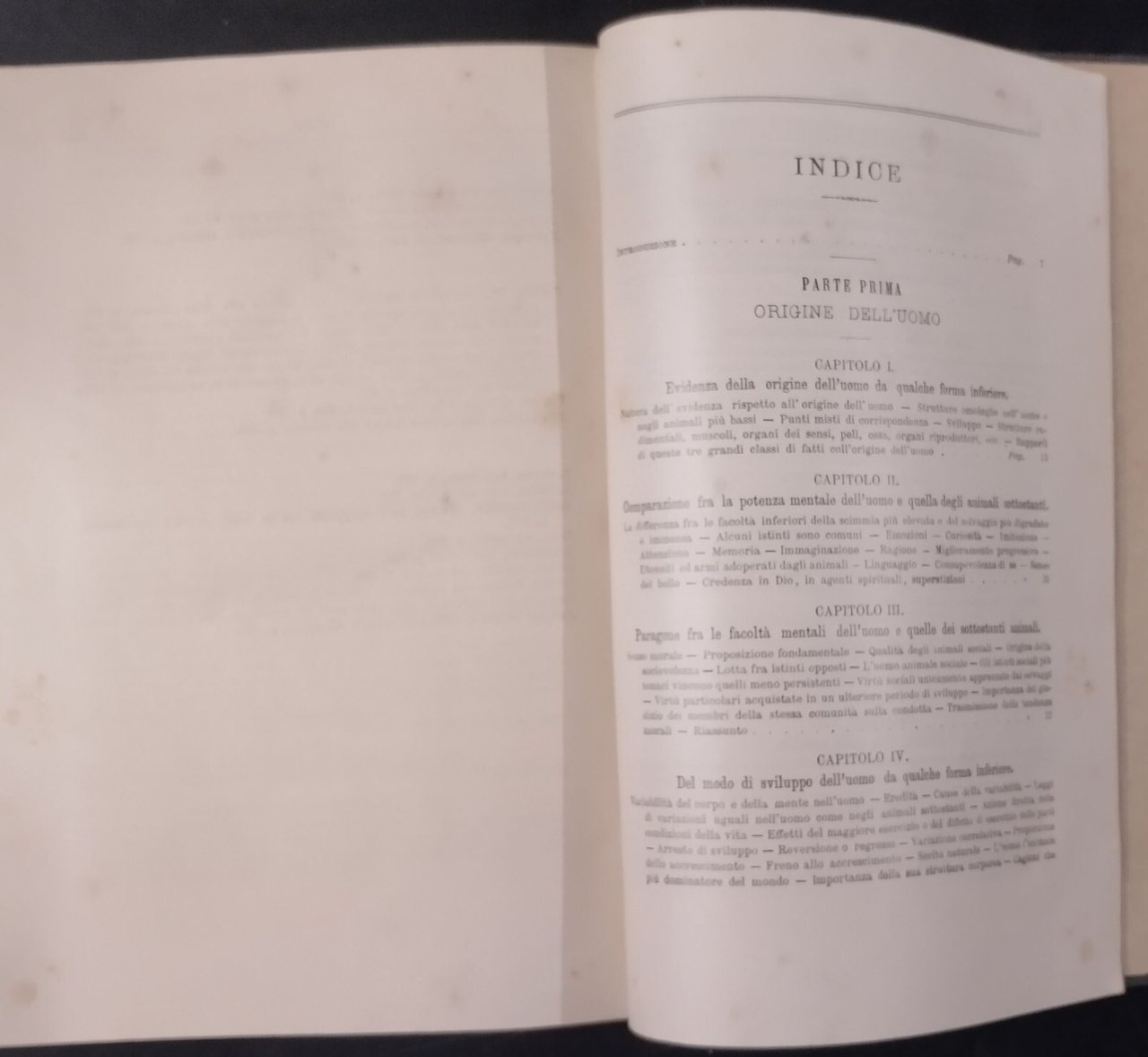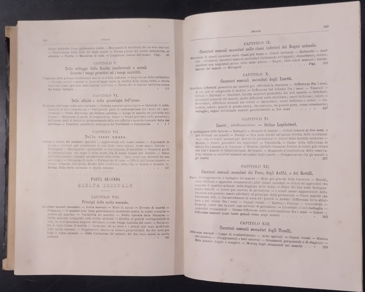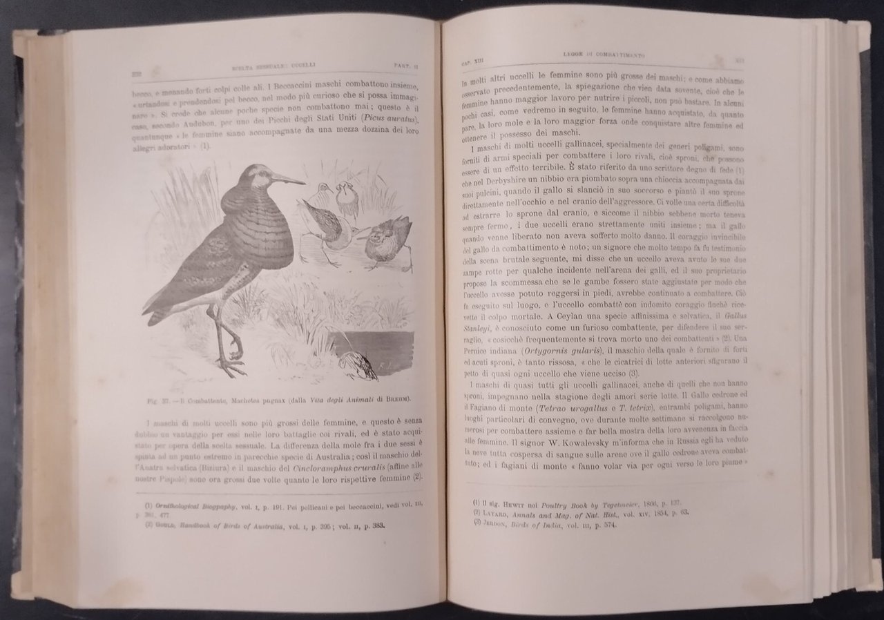 L'ORIGINE DELL'UOMO E LA SCELTA IN RAPPORTO COL SESSO di Carlo Darwin Prima traduzione italiana col consenso dell'autore di Michele Lessona.Torino , Unione tipografico Editrice, 1871. 671 pagine, numerose illustrazioni in bianco e nero nel testo. Copertina editoriale in mezza pergamena. Dimensioni: 18,5 x 26 cm. Stato di conservazione: molto buono (pagine normalmente ingiallite) Libro usato saggistica