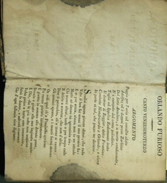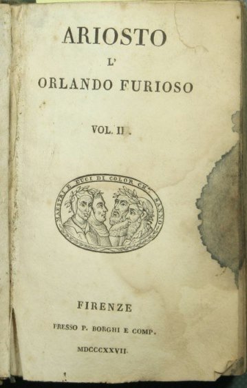 in 24° - pp.291 - Mezza pergamena - Incisione al frontespizio - Macchia al margine delle prime pagine, margine superiore rifilato - Dal Canto ventesimoterzo al Canto trentesimosecondo