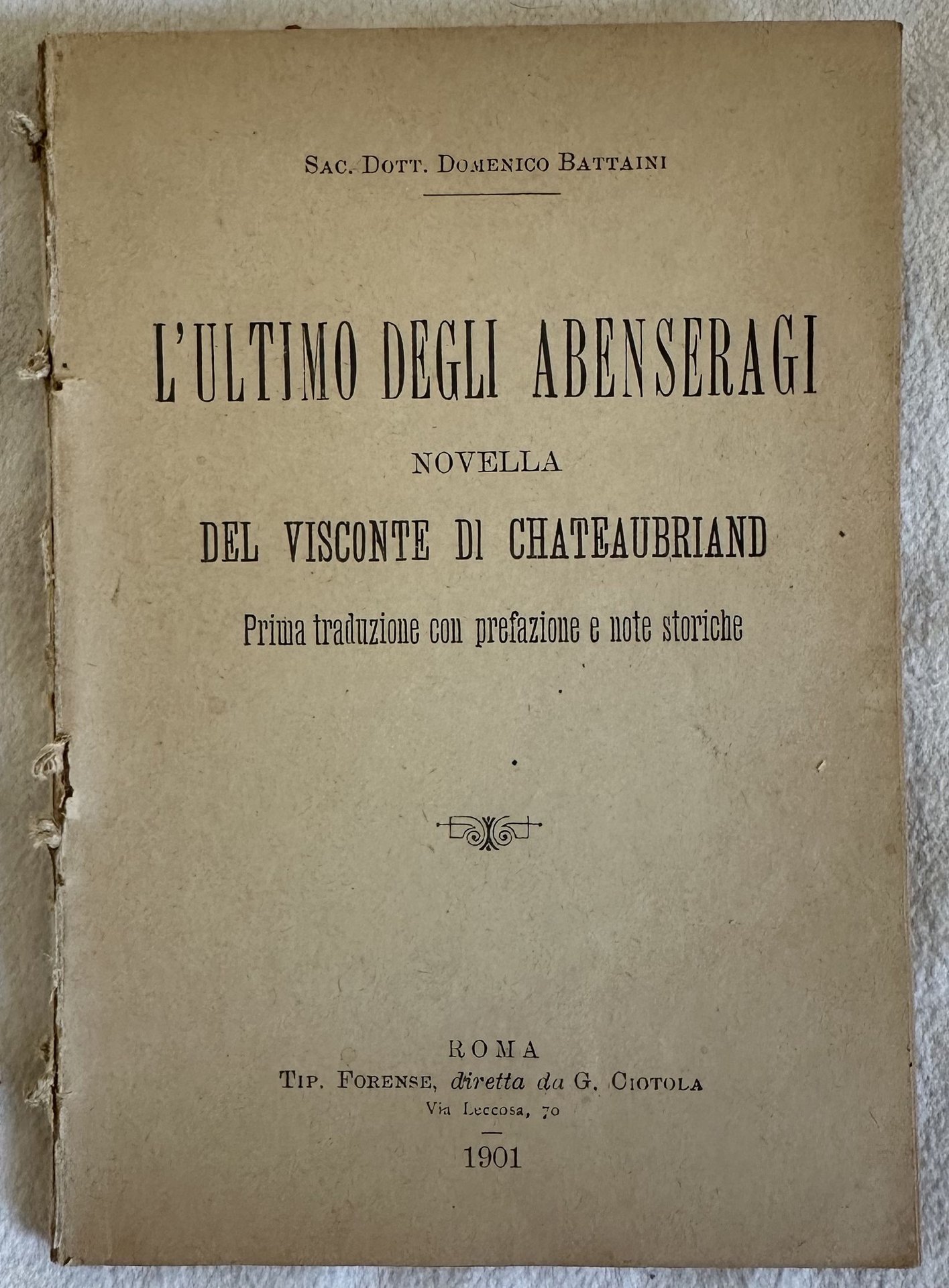 Prima edizione italiana del 1901 del romanzo "L'ultimo degli abenseragi" di Renè de Chateaubriand. Traduzione con prefazione e note di Domenico Battaini. In discrete condizioni. Copertina assente Legatura in buone condizioni. Pagine in ottime condizioni con rare fioriture. In 16. cm 15,5x11. pp. 98.First italian edition of 1901 of the novel "L'ultimo degli abenseragi" by Renè de Chateaubriand. Translation with prefation and notes by Domenico Battaini. In fair conditions. Cover lacks. Binding in good conditions. Pages in very good conditions with occasional foxings. In 16. cm 15,5x11. pp. 98.