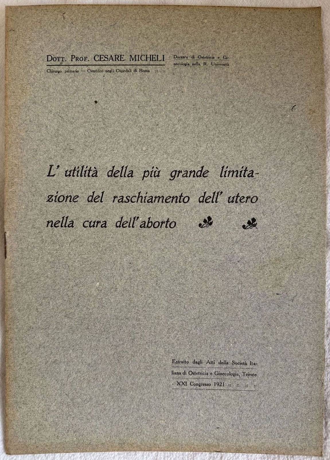 L'UTILITA DELLA PIU GRANDE LIMITAZIONE DEL RASCHIAMENTO DELL'UTERO NELLA CURA DELL'ABORTO | Livres anciens et modernes | Cesare Micheli