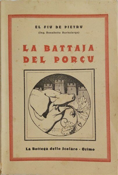 in-8, pp.87, (2), bross. edit. con cop. fig. Con disegni a piena pag. di Virgilio Carotti. Seconda edizione dello scritto dell'A. che si firma "El Fiu de Pietru". Dedica ms all'occhietto. Belle pagine di poesie dialettali marchigiane riferite alla storica rivalità tra gli abitanti di Osimo e quelli di Ancona, e alla figura di Boccolino Guzzoni vissuto a Osimo intorno alla metà del XV sec. Raro. Bell'esempl. su carta distinta. [194]