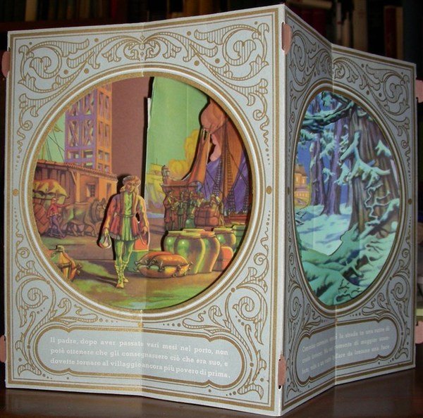 in-8 gr. (mm. 240x195), cartonato editoriale con decorazioni ad intaglio al piatto ant. Collana Radiale Patentado. Rara edizione di libro animato per bambini “a stella”: si compone di 5 pagine in cartoncino a colori con le scene sovrapposte a tre livelli, una volta aperto completamente a cerchio dà origine alla fiaba composta da 6 scenografie prospettiche, mentre in calce è leggibile il testo. Questo genere di libri sono molto rari per la loro fragilità. Manca il fascicoletto allegato di testo. Minimi dif. al d. ma ottimo esempl. [089]