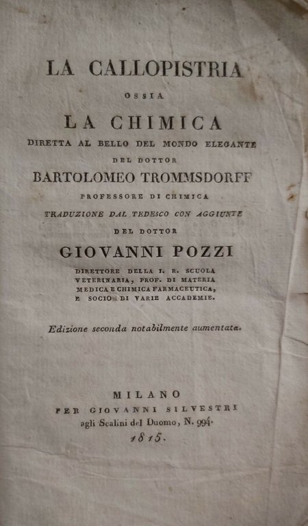 LA CALLOPISTRIA ossia la chimica diretta al bello del mondo elegante del Dottore. Traduzione dal tedesco con aggiunte del Dottore Giovanni Pozzi.