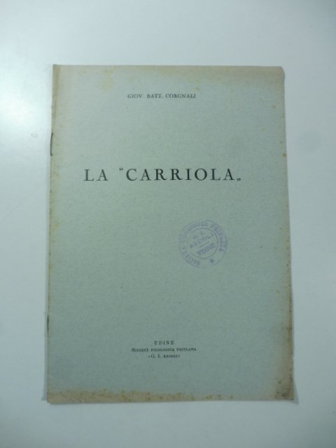 In 8 (cm 17 x 24), pp. 14 + (2b). Brossura editoriale. Estratto editoriale dal Bollettino della Societa' Filologica friulana con timbro al piatto anteriore. Saggio relativo ad un atto notarile di Antonio Porenzoni in cui, nell'elenco degli arredi dell'episcopio di Concordia del 1489, si fa riferimento ad una 'carriola d'abete' accanto ad una lettiera non stanti tra loro insieme cioe' scompagnate. L'A. cerca quindi di capire che cosa sia questa carriola citata anche in altri documenti dell'epoca.