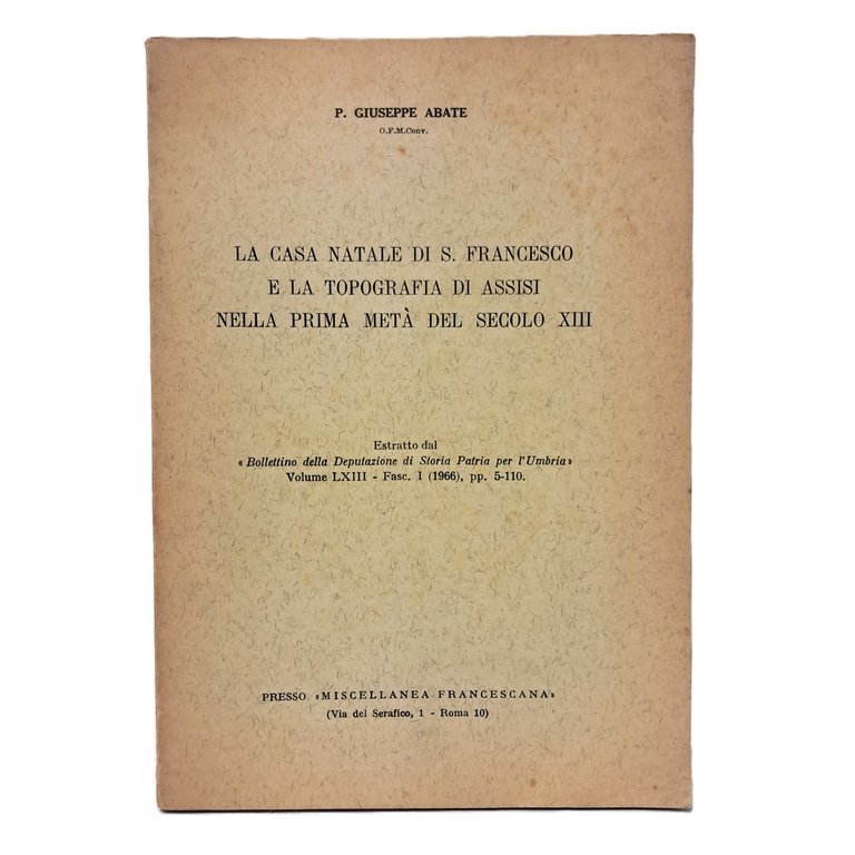Estratto dal Bollettino della Deputazione di Storia Patria per l'Umbria Vol. LXIII Fasc I. Descrizione della casa natale di S. Francesco con topografia di Assisi in contraddittorio con l'opera di Fortini Arnaldo che, nella Nova Vita situava la casa paterna di San Francesco in Porta San Giacomo in una casa situata fra la chiesa di San Nicolò di Piazza e quella di San Paolo dove si vuole dimostrare l'infondatezza di questa ipotesi. Seguono poi delle precisazioni sulla genealogia di S. Francesco, i nomi di Pica e Piccardo e altre genealogie del Fortini. In brossura. Con XXIII tavole in bianco/nero e piantine topografiche. Pp. 112. Buone condizioni.