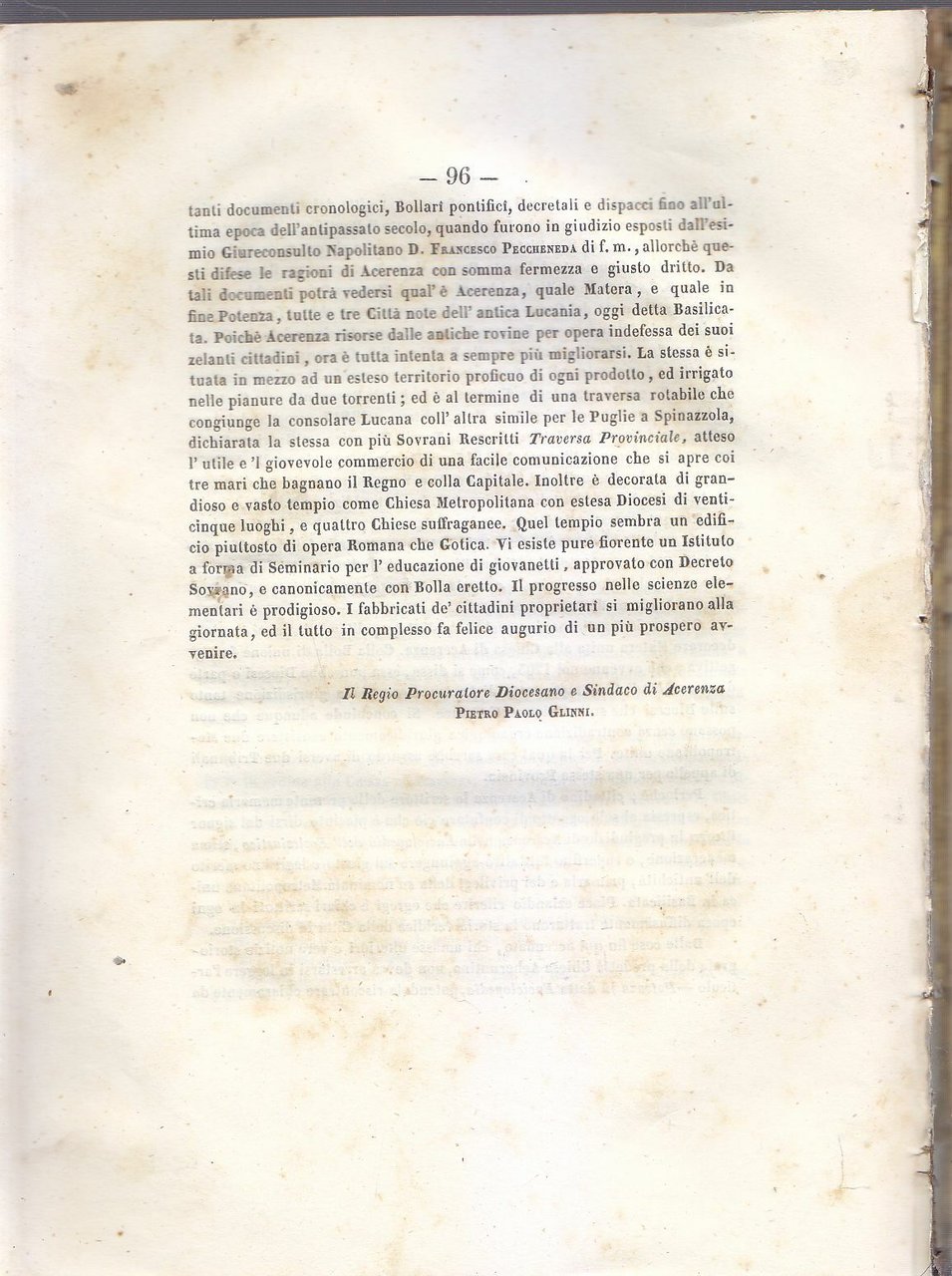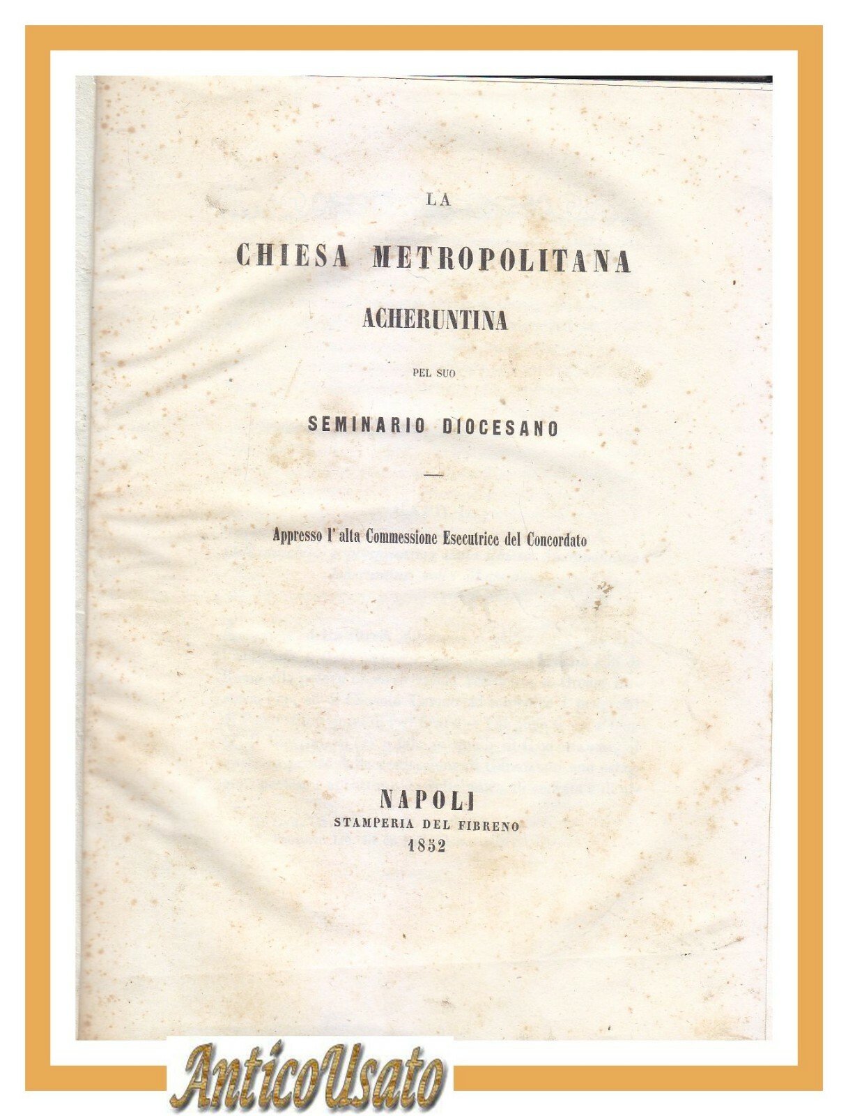 pel suo Seminario diocesano appresso l'alta Commessione esecutrice del Concordato. Napoli, stamperia del Fibreno, 1852. 96 pagine, ritratto di Francesco Peccheneda fuori testo. Copertina MANCANTE. Stato di conservazione: molto buono (esemplare molto fresco con poche fioriture, manca la copertina perchè proveniente da miscellanea)