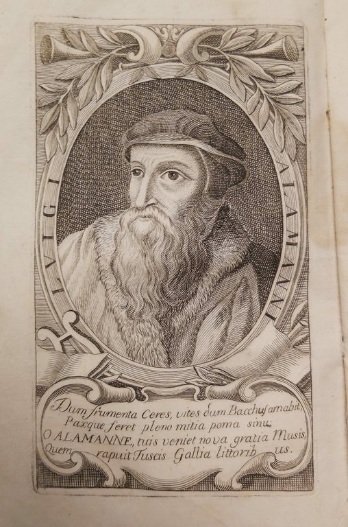 in-8, pp. 96, 280, leg. cart. rust. coevo con tass. al d. Con il ritr. dell’Alamanni in antip. Front. a due colori. Prima ediz. remondiniana.