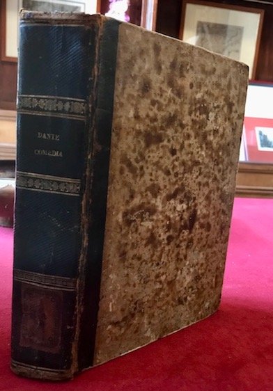 8vo (cm. 22), 2 cc.nn. (compreso frontis. litografico con ritratto di Dante), 744 pp. Con tre tavv. f.t. poste al principio di ciascuna Cantica. Testo su due colonne. Legatura coeva in mz. pelle con fregi e titolo impressi in oro al ds. (lievi abrasioni e tracce d’usura). Timbretto di appartenenza al frontespizio. Fioriture sparse ma buon esemplare nel complesso.