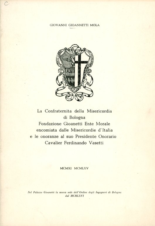 Fondazione Gioanetti Ente Morale encomiata dalle Misericordie d'Italia e le onoranze al suo Presidente Onorario Cavalier Ferdinando Vasetti. 1911-1965. Illustrazioni in nero f.t. 945.411 � Ba In Quarti ( 24-30cm ) Ottimo (Fine) Ottimo