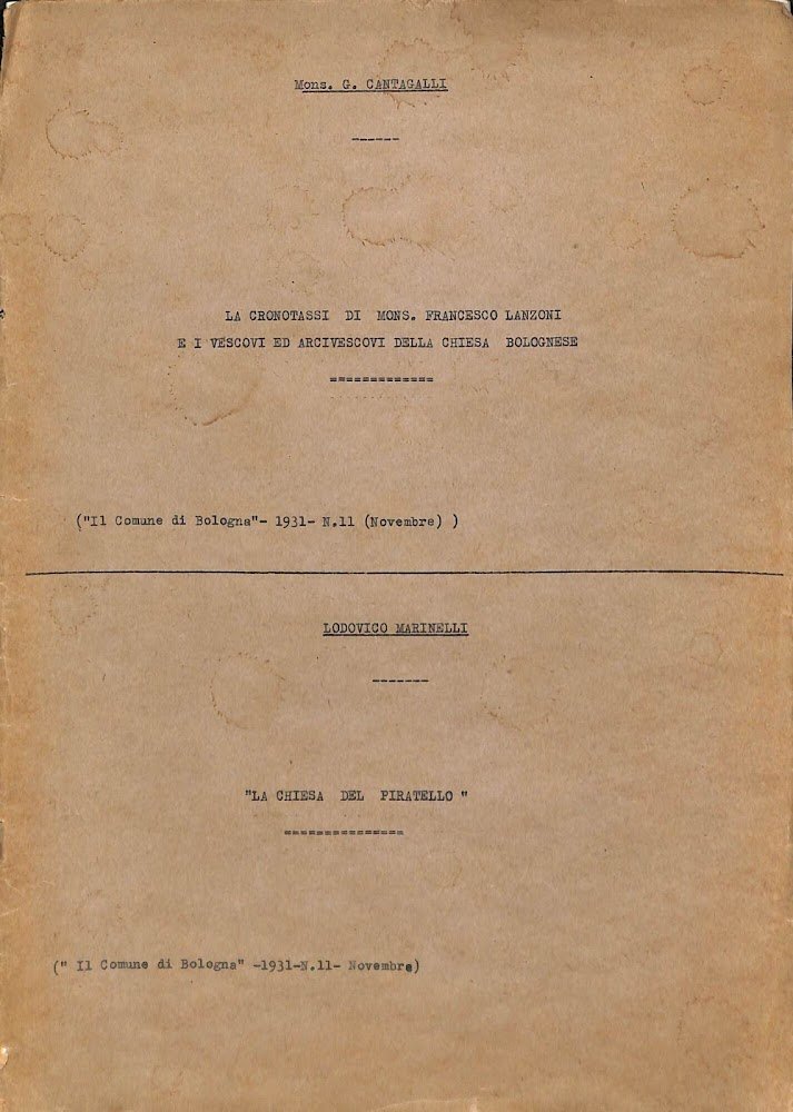La cronotassi di Mons. Francesco Lanzoni e i Vescovi ed Arcivescovi della Chiesa bolognese di mons. G. Cantegalli - La Chiesa del Piratello di Lodovico Marinelli, Estratto da Il Comune di Bolognan n. 11 (novembre 1931), pp. 17-47. Numerose ill. in nero n.t. 945.41 LOC - Ba Buono (Good)