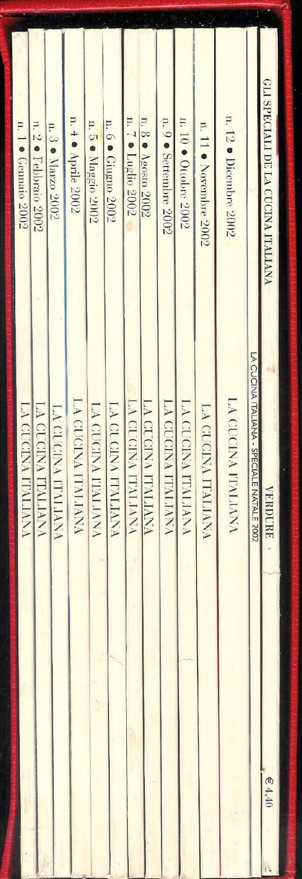 "La Cucina Italiana" è dal 1929 il più autorevole mensile di gastronomia e di cultura alimentare. Gode della più lunga tradizione sia in in Italia che nel resto del mondo. E' ricchissimo non solo di ricette (con bellissime foto a colori) ma anche di rubriche, segnalazioni di nuove tendenze, novità di cucina e consigli per la casa. Quest'annata (2002) oltre alle pubblicazioni mensili complete (da gennaio a dicembre) include le pubblicazioni "Speciale Natale 2002" + "Verdure". Tutte le pubblicazioni sono raccolte in un cofanetto color rosso . in quarto Molto buono (Very Good) In ottima condizione in ogni sua parte.