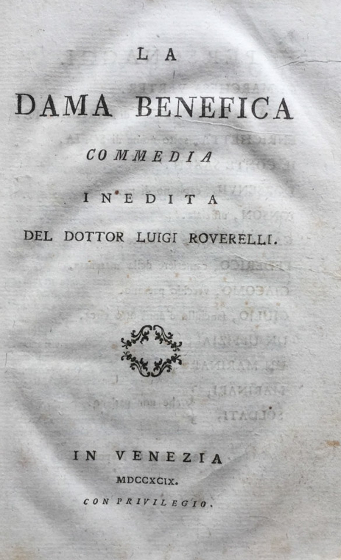 Venezia, 1799, in 16mo. Brossura editoriale, 75 pp. Al testo della commedia seguono Notizie storico critiche dopra la dama benefica. 852 - V In Sedicesimi (10-17cm ) Buono (Good) Buono