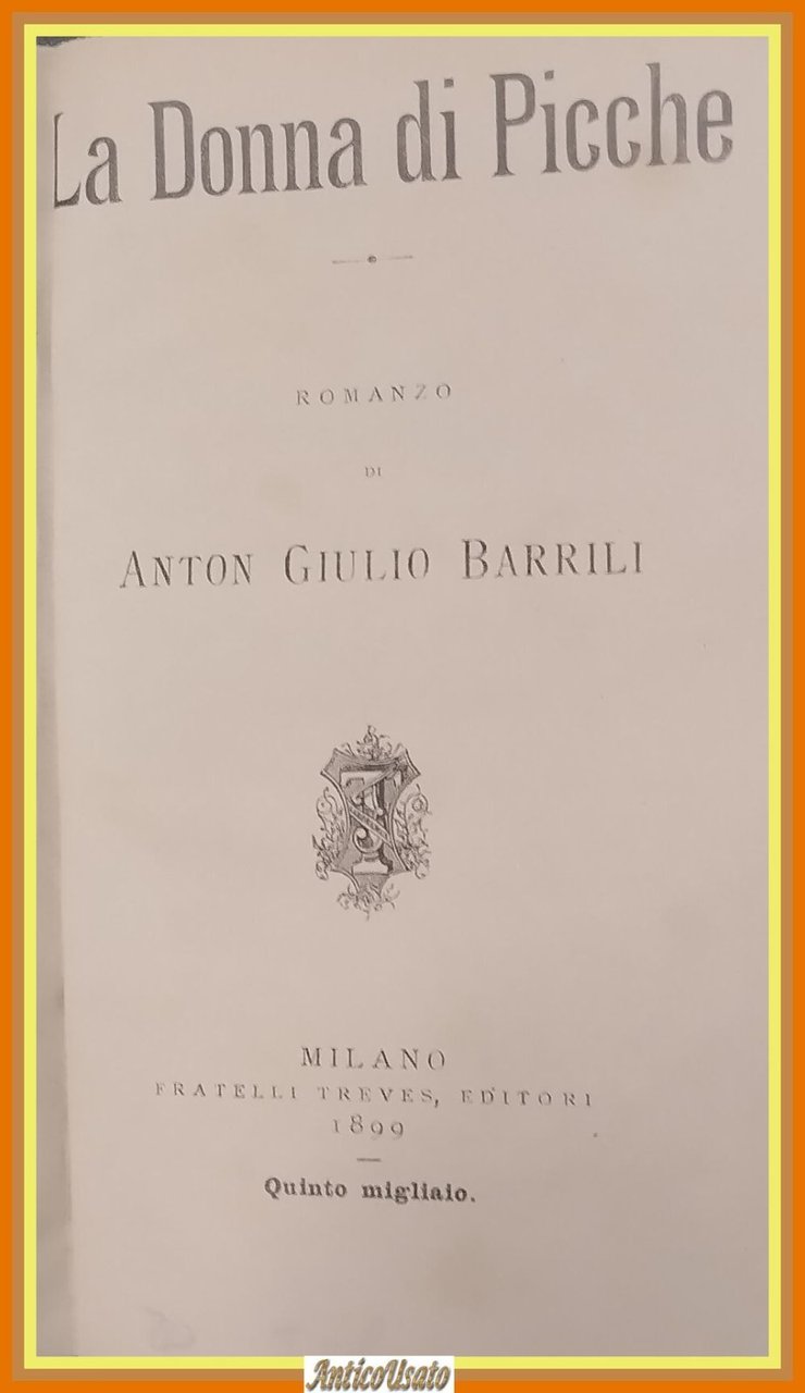 LA DONNA DI PICCHE di Anton Giulio Barrili. Fratelli Treves Editore, I edizione quinto migliaio, 1899 . 328 pagine. Copertina non editoriale in mezza tela. Stato di conservazione: molto buono (pagine ingiallite) Libro antico romanzo letteratura italiana