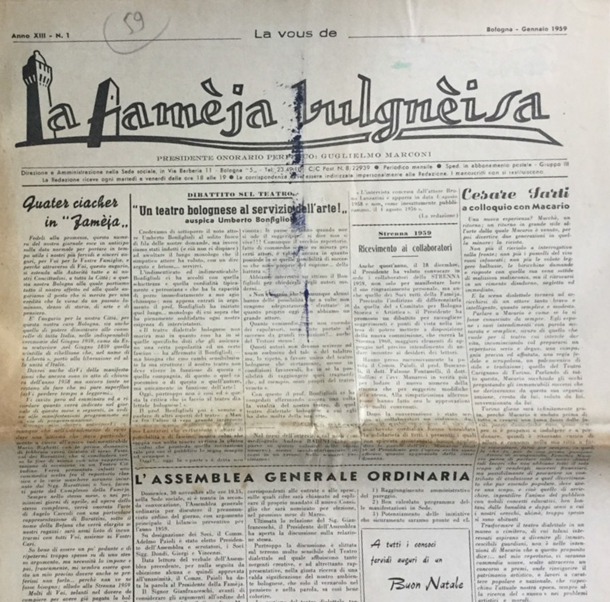 La vous de La fameja bulgneisa 1959 annata completa. Numero di febbraio: speciale sulla morte di Augusto Majani (Nasica). Nel mese di agosto cambia formato (da 32,5 x 44 a 35 x 50 cm) Contestualmente il titolo passa da La vous de La fameja bulgneisa a La fameja bulgneisa. Lievemente macchiato il primo fasciolo. in folio - oltre 38 cm Buono (Good) Buono