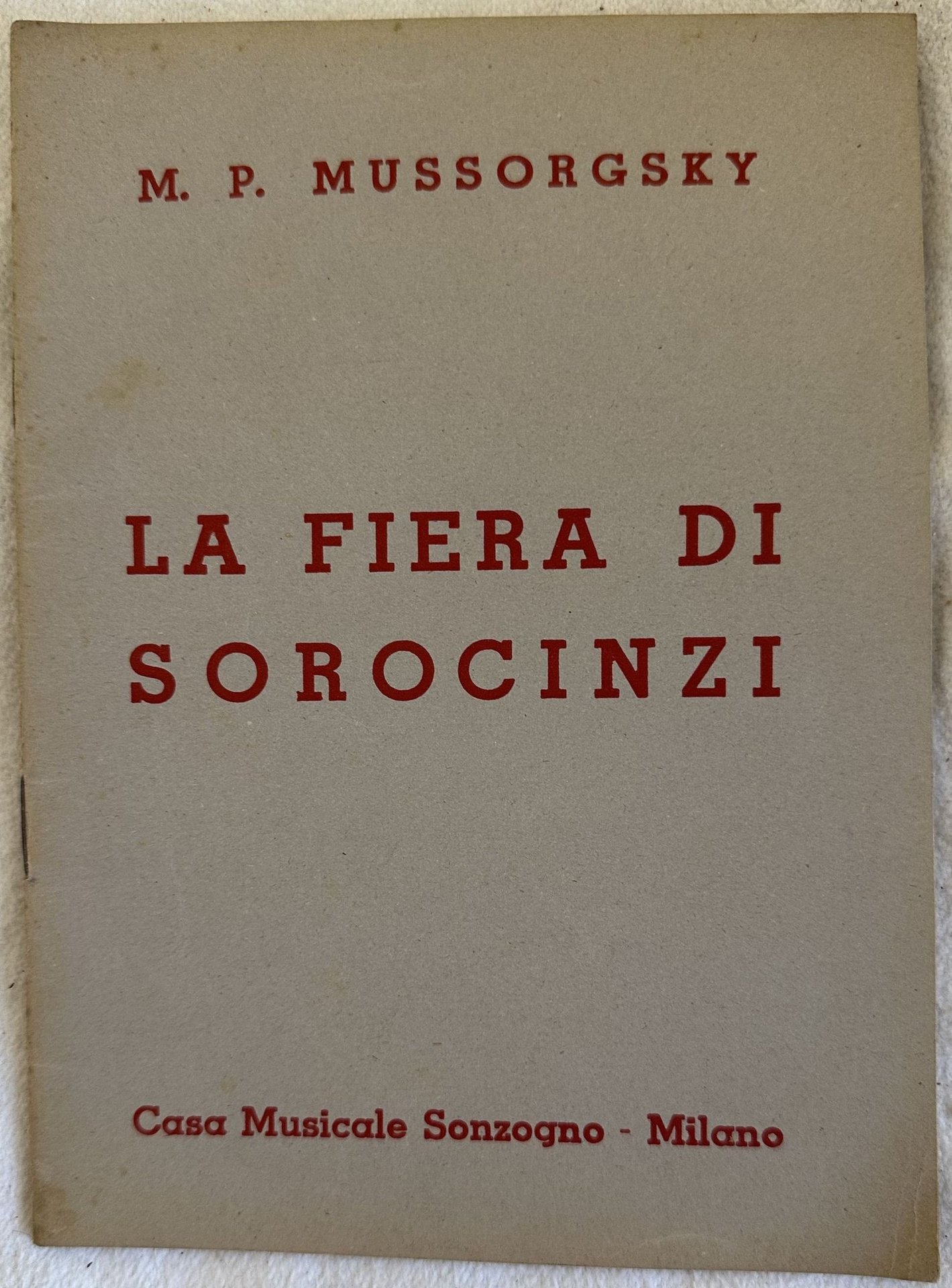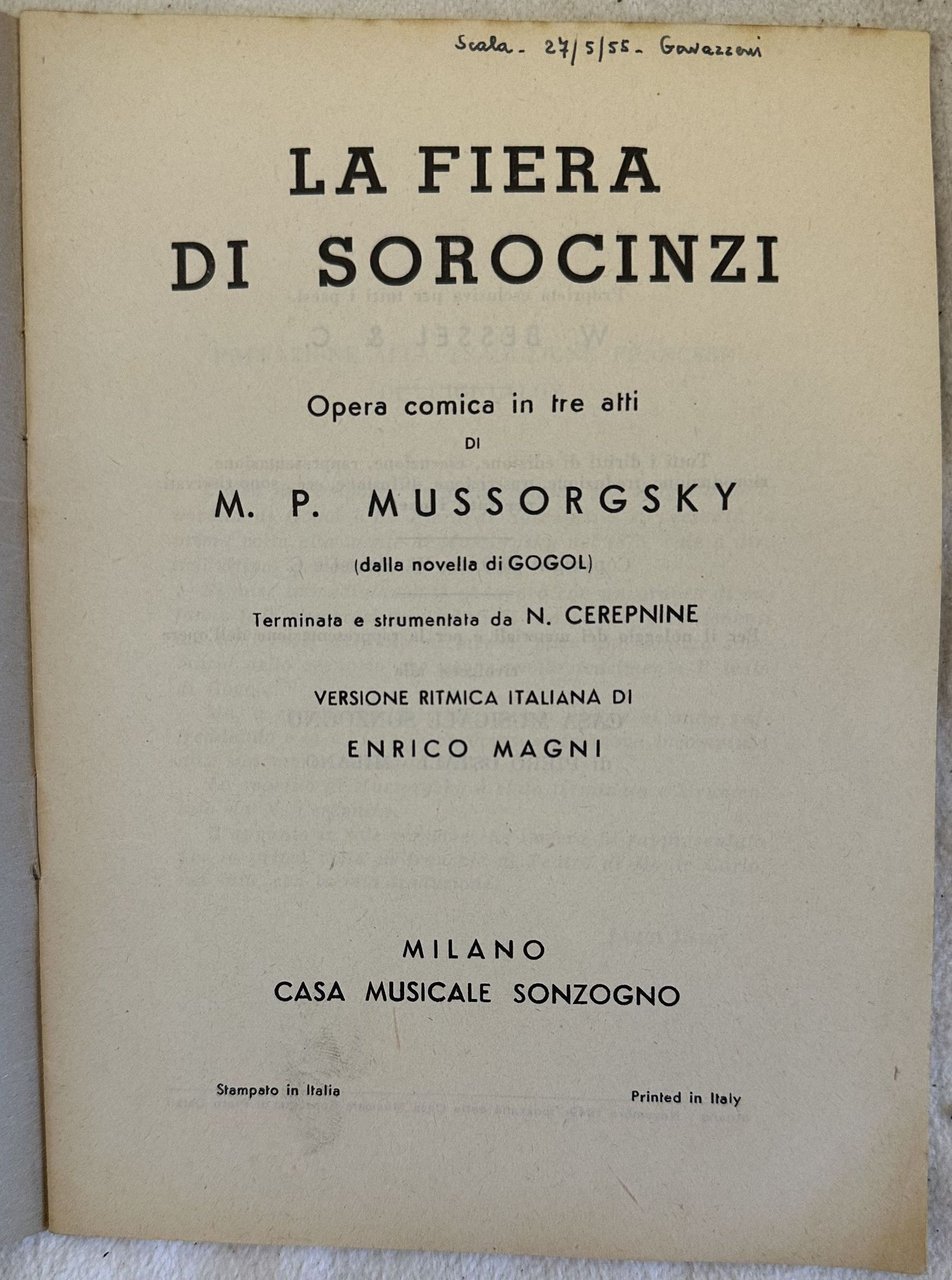 Edizione del novembre 1949 del libretto d'opera "La fiera di Sorocinzi" di Modest Mussorgsky (1839-1881) basata su una novella di Gogol. Terminata e strumentata da N. Cerepnine. Versione ritmica italiana di Enrico Magni. La prima rappresentazione ebbe luogo San Pietroburgo l'8 ottobre 1913. Nota manoscritta al frontespizio: "Scala Gavazzeni 27 maggio 1955). Segue indicazione manoscritta degli attori di quella rappresentazione. In ottime condizioni. Copertina editoriale in ottime condizioni con lievi usure ai margini e dorso. Legatura in buone condizioni. All'interno le pagine si presentano in ottime condizioni con rare fioriture. In 8. cm 19x14. Pp. 38+(1).Edition of november 1949 of the booklet of the work "The Fair of Sorochyntsi" by Modest Mussorgsky (1839-1881) based on a novel by Gogol. Instruments by Cerepnine. The first representation took place in Saint Petersburgh the 8th of october 191 Handwritten note in the titlepage: "Scala Gavezzeni 27 maggio 1955). Handwritten note with indication of actors of that representation In very good condit Editorial cover invery good conditions lightly worn in the extremities. Binding in good conditions. Pages are in very good conditions with occasional foxing. In 8. cm 19x14. Pp. 38+(1).