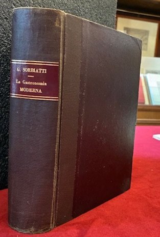 8vo (cm. 21,7), 820 pp., 1 c.nn. Con una tavola litografica a doppia pagina ripiegata in fine (’Buffet per un servizio dansant’). Legatura ‘900 in mz. tela con titolo oro su tassello in pelle al ds. Assente una tavola ripiegata in fine, strappo con parziale perdita di testo alle pp. 19-20, alcune macchie che non compromettono la leggibilità tra le pp. 263 e 272, traccia di nastro adesivo a p. 815 (Indice). L’autore divide il suo trattato in sei parti: cucina, pasticceria di cucina, pasticceria dolce, confettureria, la credenza, precetti generali intorno al servizio di tavola. In totale sono circa 1600 le ricette che Sorbiatti inserisce in questa sua opera e che gli resero grande fama, tanto da divenire responsabile di cucina al Grand Hotel de Milan. Prima edizione. Cfr. Westbury, p. 207. Un’edizione del 1888 in Vanossi ’Bibliografia gastronomica italiana’ (n. 561).