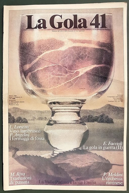 Edizione: n. 41 della rivista la gola (anno 5) marzo 1986 - la gola mensile del cibo e delle tecniche di vita materiale 㨠stata una rivista italiana di gastronomia e cultura materiale. fondata nel 1982 e co-diretta da antonio porta e alberto capatti, il progetto grafico 㨠di gianni sassi. edita dal 1982 al 1988 da intrapresa cooperativa di promozione culturale, ha sospeso le pubblicazioni dal 1989 al 1990. dal 1991 al 1993 㨠edita da nibbio editore in milano.