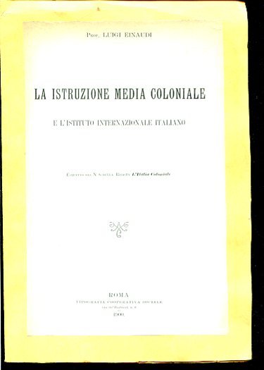 In-8°, pp. 6, brossura editoriale verde acqua con piccoli restauri marginali. Tracce d'uso. Estratto da 'L'Italia Coloniale', n. 6. Memoria composta da Einaudi ventiseienne sull'istruzione media nelle colonie italiane. Firpo, 218.