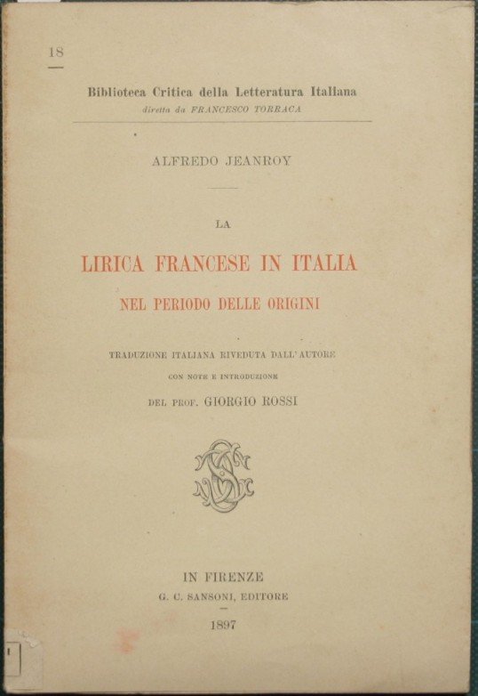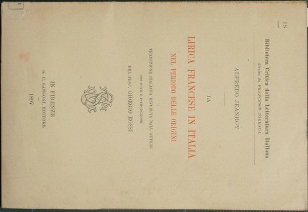 Nel periodo delle origini - Traduzione italiana riveduta dall'autore con note e introduzione del Prof. Giorgio Rossi - Collana Biblioteca critica della letteratura italiana diretta da Francesco Torraca. N. 18 - in 16° - pp.XXII + 72 - Brossura editoriale - Volume intonso