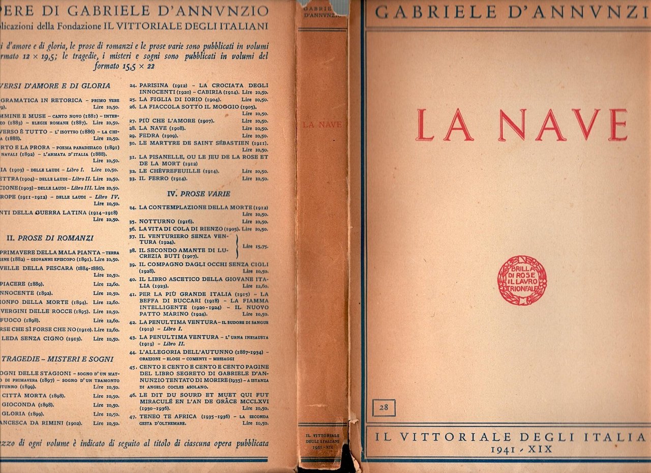 LA NAVE di Gabriele D'Annunzio. Il Vittoriale degli Italiani Editore, 1941. 261 pagine. Copertina editoriale in brossura muta con sovraccoperta. Stato di conservazione: molto buono (pagine normalmente ingiallite, sovraccoperta un po' sciupata) Libro usato poesia letteratura italiana