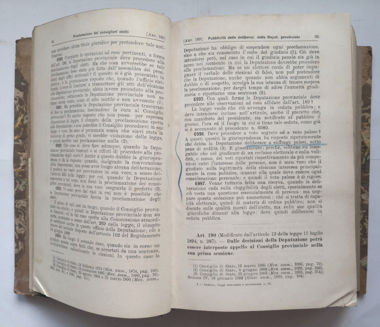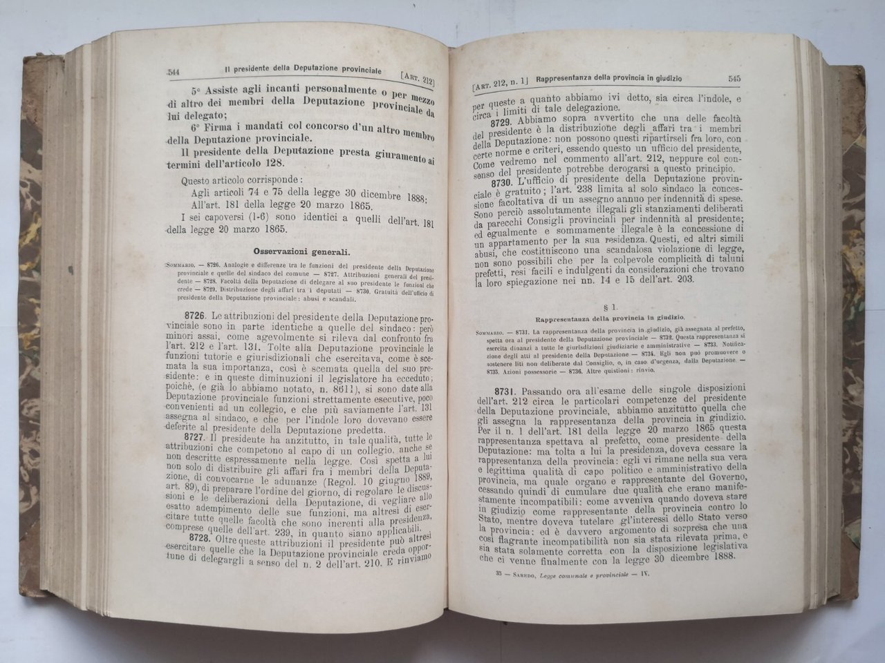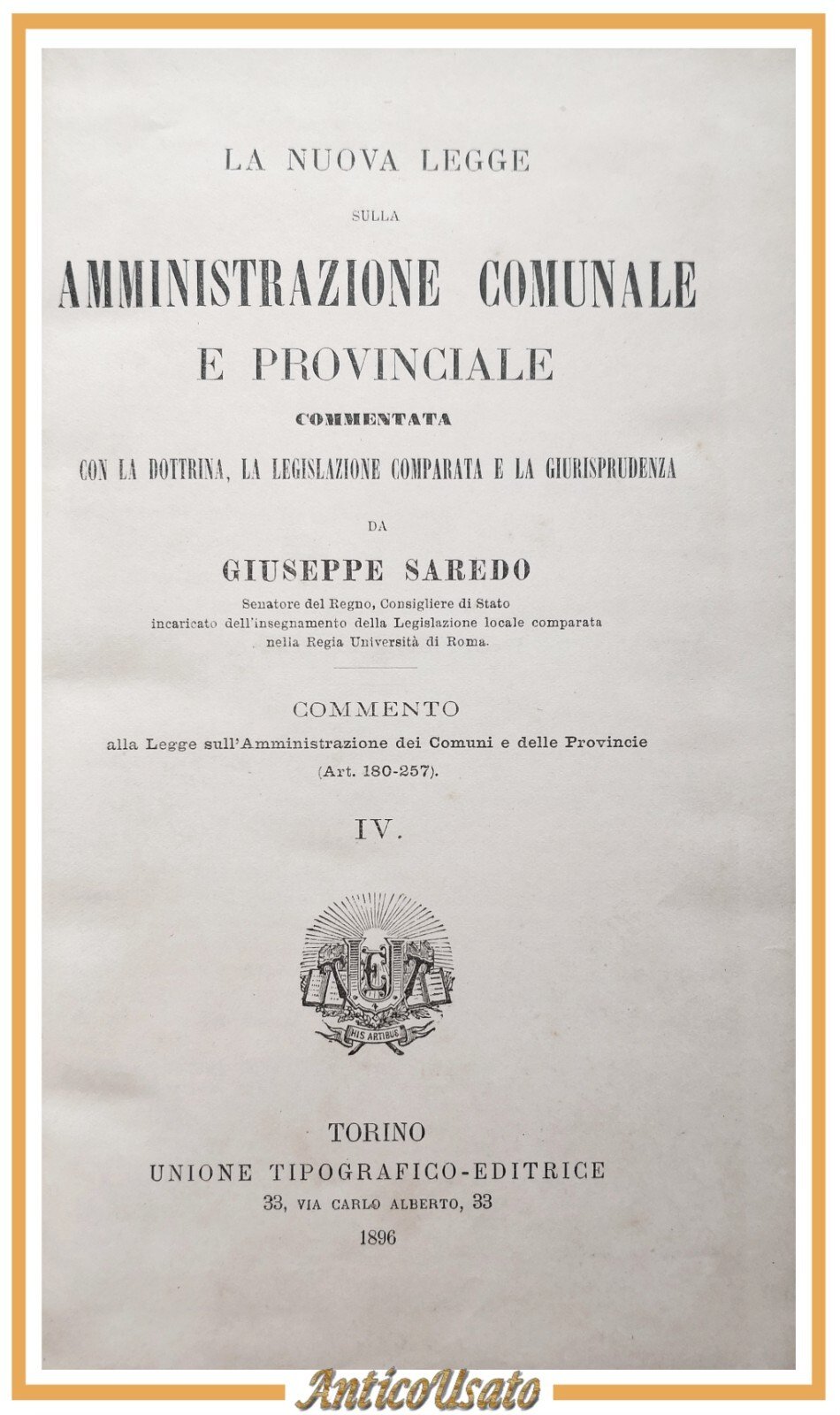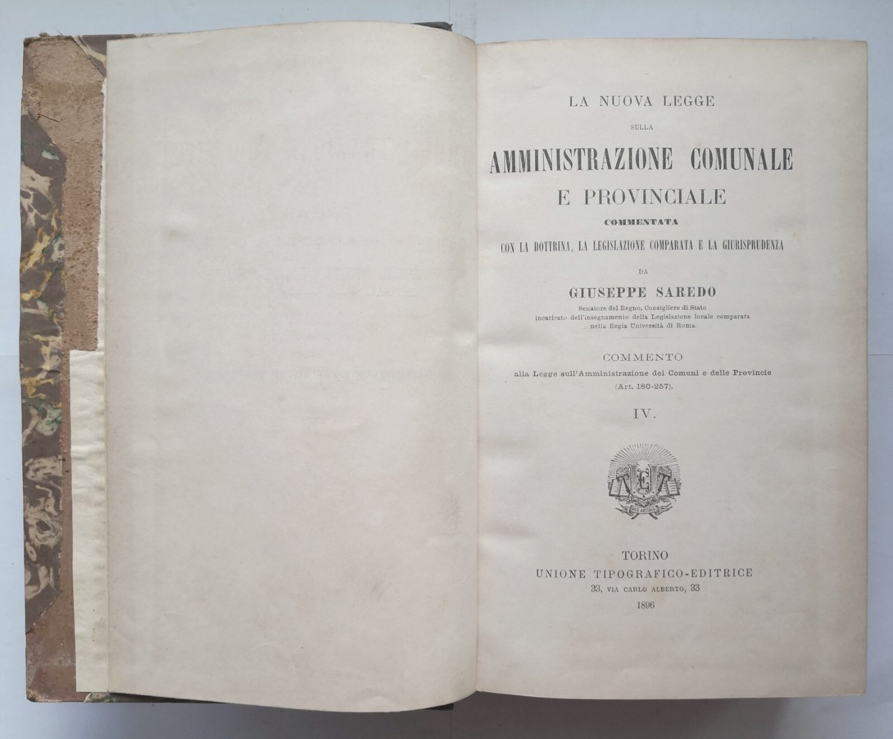 LA NUOVA LEGGE SULLA AMMINISTRAZIONE COMUNALE E PROVINCIALE commentata con la dottrina, la legislazione comparata e la giurisprudenza da Giuseppe Saredo. SOLO IL Volume IV.