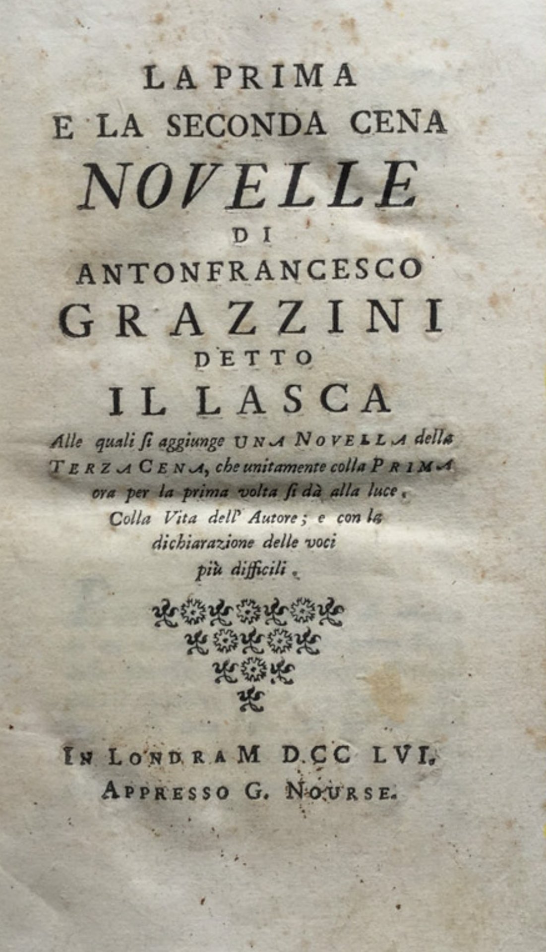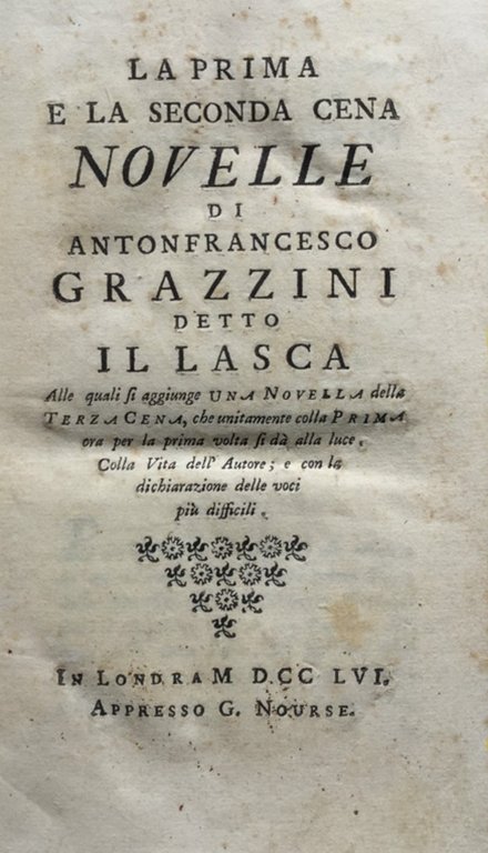 Alle quali si aggiunge una novella della Terza cena, che unitamente colla Prima ora per la prima volta si da alla luce. Colla vita dell'autore- e con la dichiarazione delle voci piu difficili. 3 parti in numerazione continua in un tomo: pp. XXXII, 120- 121-412, (10) p. Mezza pelle e cartonato con carta marmorizzata. Incisioni in oro riportate sul dorso su placchetta in pelle rossa. Copia lievem. rifilata, segnetti a penna alle ultime due facciate. Tagli spruzzati in giallo. 853- V In Ottavi (15-23cm ) Ottimo (Fine) Ottimo