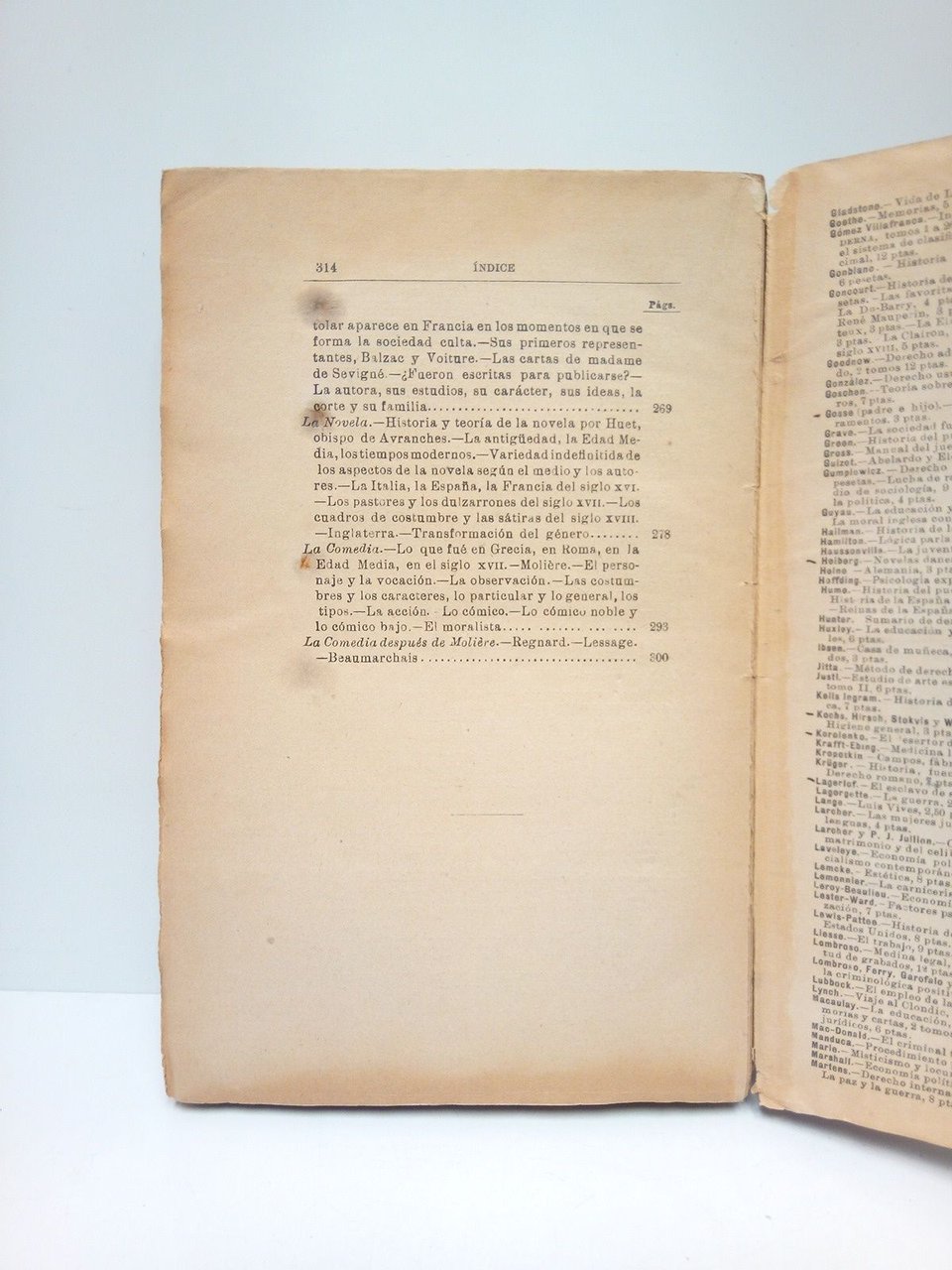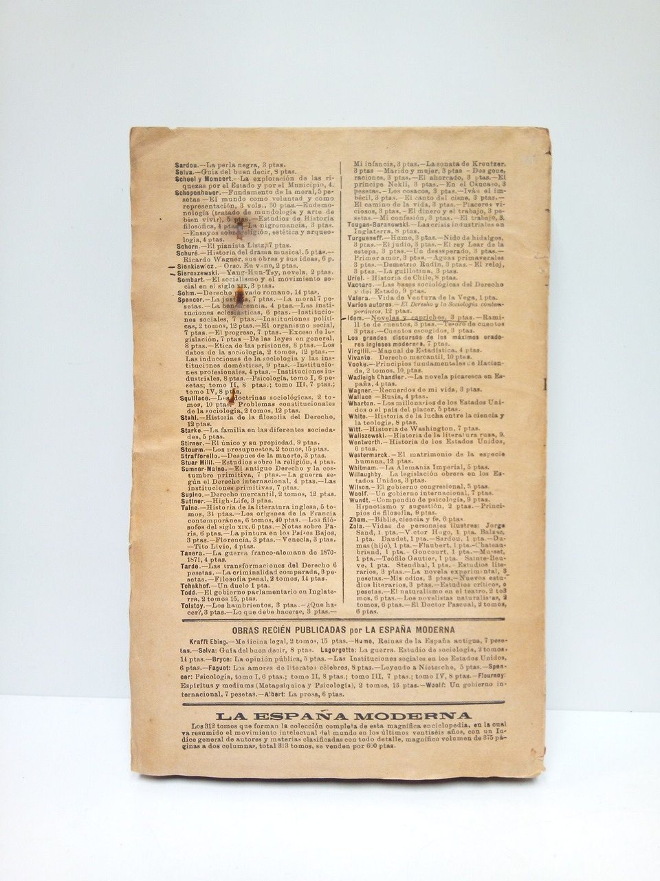 Madrid: La España Moderna, [ca. 1900].- 307 p.; 4º (22,5 x 14,5 cm); Rústica Ed.- (Biblioteca de Jurisprudencia, Filosofía e Historia. 595).* Lomo con manchas de humedad y ligeramente reforzado. La cubierta anterior con una pequeña señal de humedad en su esquina inferior interna (junto al lomo), la cubierta posterior y las últimas seis hojas con tres señales de humedad en forma de puntos que van en disminución. Por lo demás en buen estado. LITERATURA Y ESTUDIOS LITERARIOS EXTRANJEROS DE LOS SIGLOS XVI-XXI