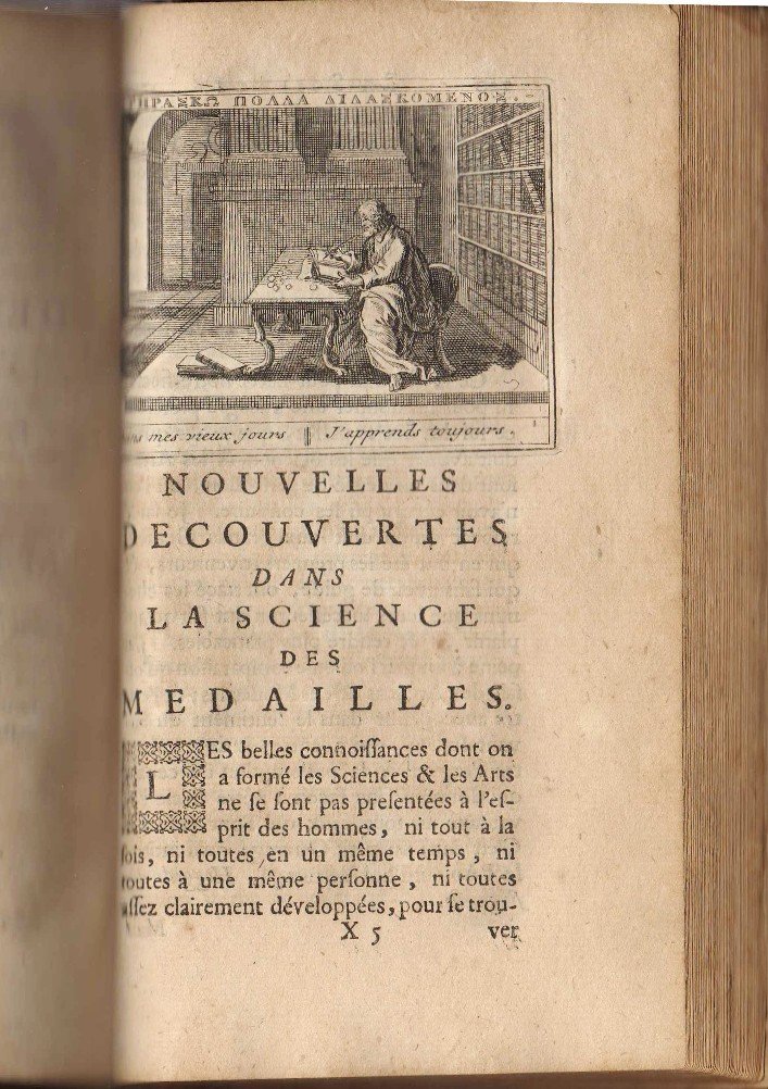in-12° (cm 17 x 10); pp. XV-[5]-399-[13]; incisione xilografica a piena pagina all'antiporta, 11 tav. più volte ripiegate raffiguranti medaglie, testate xilografate all'Avertissement e al capitolo aggiuntivo delle Nouvelles decouvertes dans le science des medailles (p. 329), testatine, finalini e capilettera xilografati; leg. coeva in piena pelle marrone, con dorso a quattro nervi, titolo in oro al dorso, decori dorati al dorso, guardie in carta bianca; frontespizio a caratteri neri e rossi. La prima edizione di tale opera del Padre gesuita Jobert Louis (1637-1719) è stata pubblicata a Parigi nel 1692 e l'anno successiva ad Amsterdam, poi nel 1715 è stata pubblicata in seconda edizione a Parigi e poi nuovamente ad Amsterdam; questa è una seconda edizione, piuttosto rara. Prov.: indicazione d'appartenenza non molto leggibile al contropiatto anteriore (ex libris Walraven). Rif.: IT\ICCU\PISE\000732. Cond.: qualche brunitura, cuffia inf. leggermente danneggiata, tracce d'uso alla legatura; opera di grande interesse, nel complesso in condizioni generali molto buone. -- 1 volume in-12, XV-[5]-399-[13] p., titre-front., 2 bandeaux, 11 planches dépl. de médailles, plein veau blond glacé, dos à 4 nerfs, caissons ornés et titre doré, ex-libris ms., manque à la coiffe inf., mors et coupes frottés, lég. traces de colle aux contreplats, pp. brunies. Célèbre traité de la science des médailles.