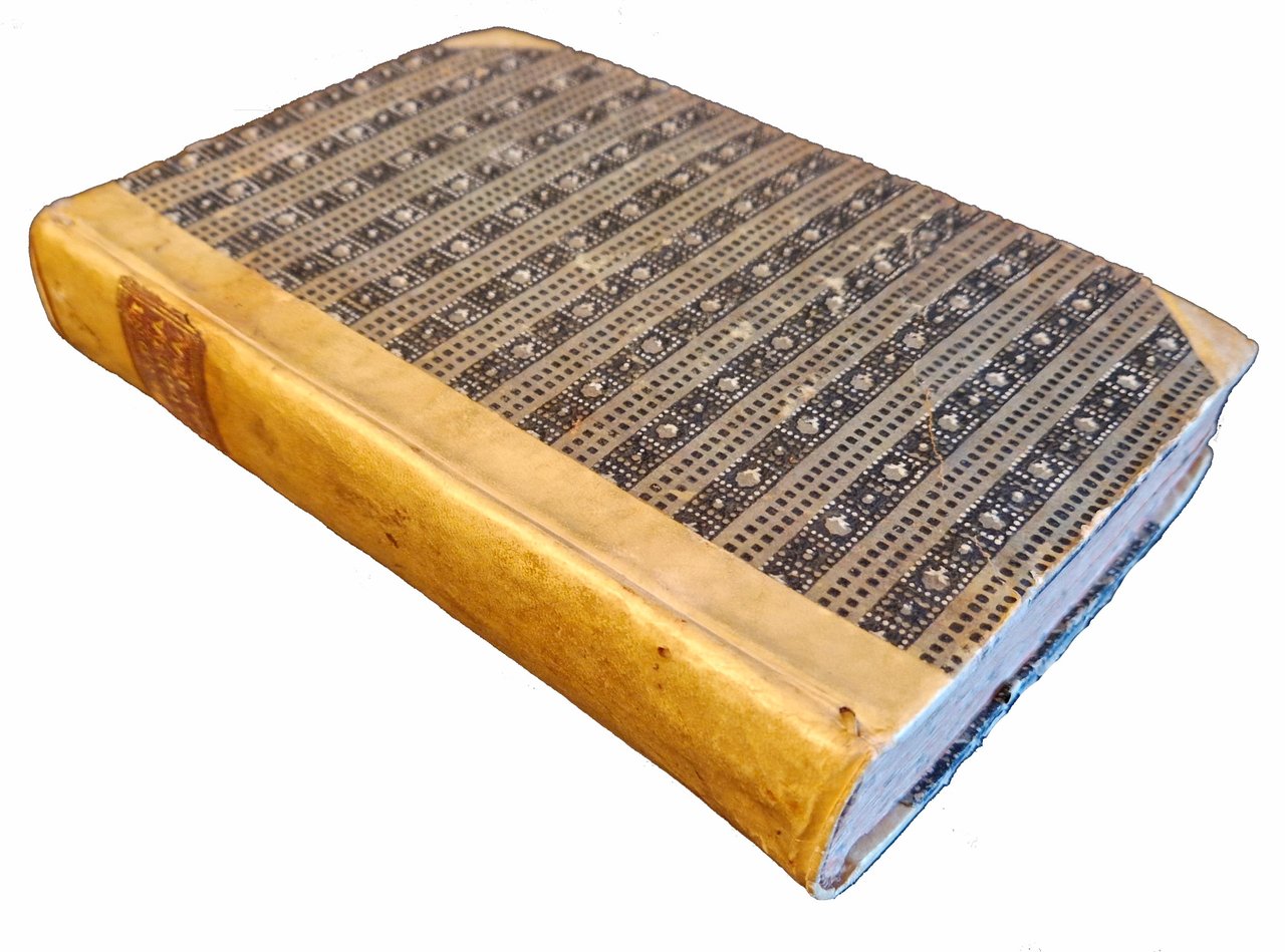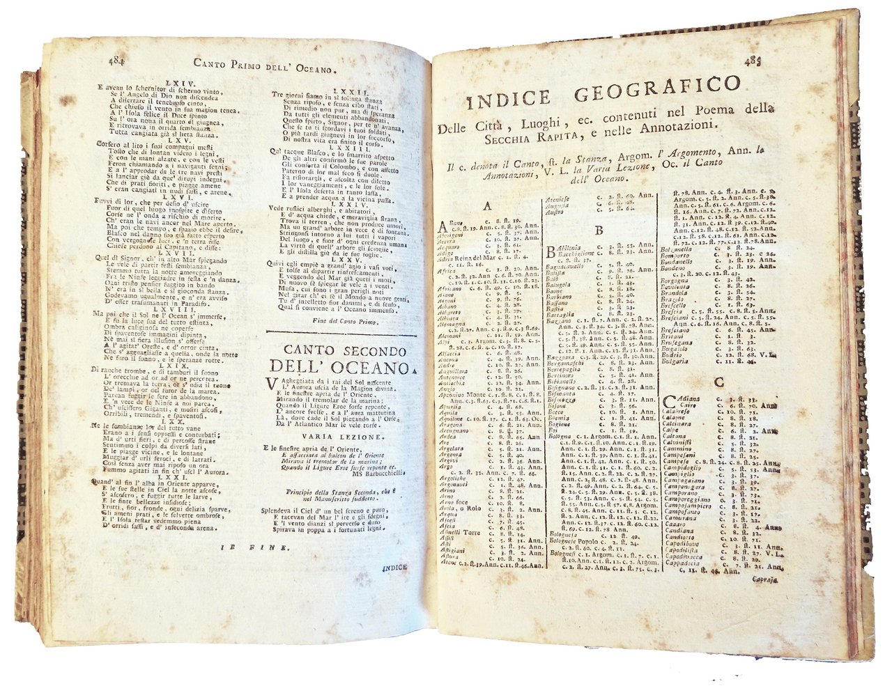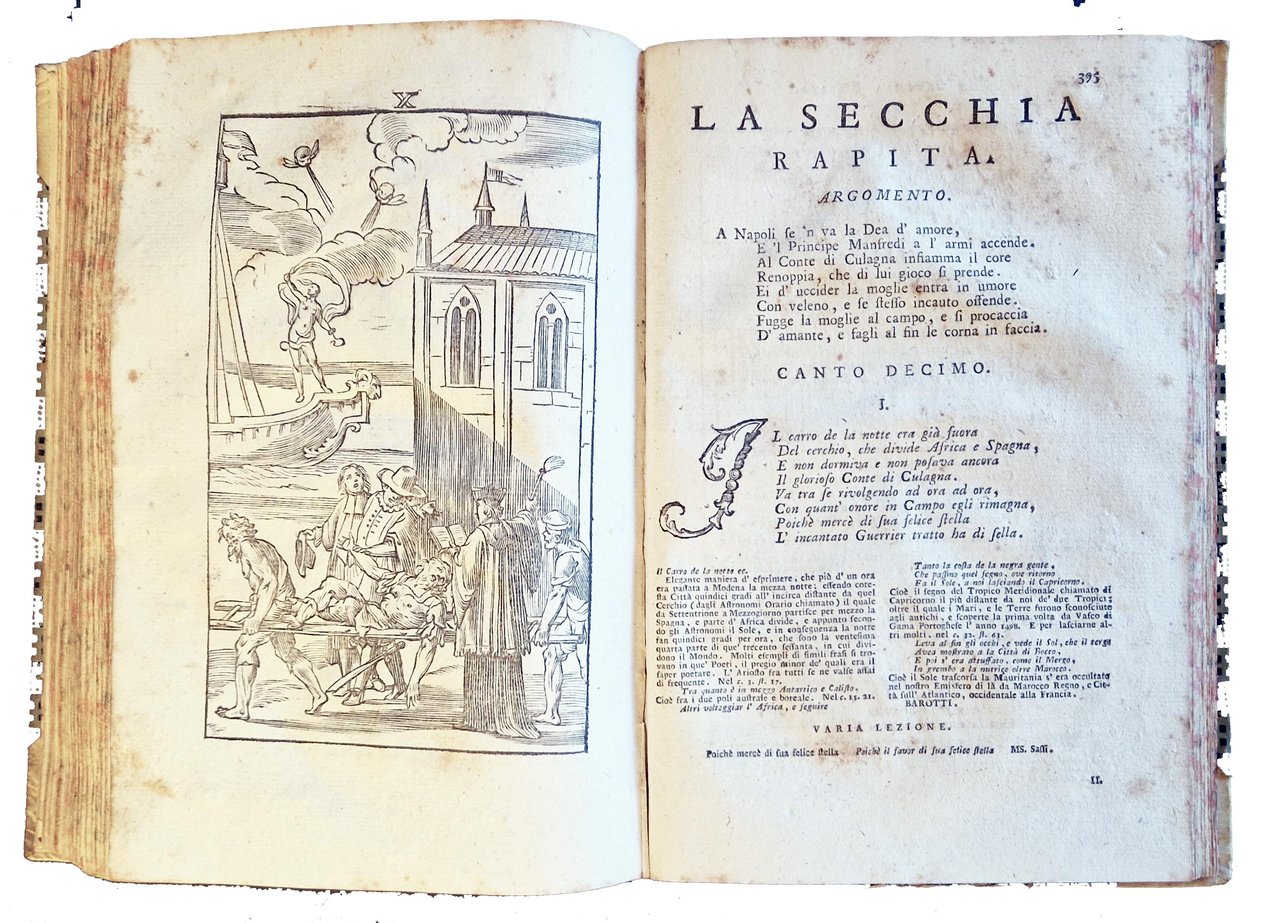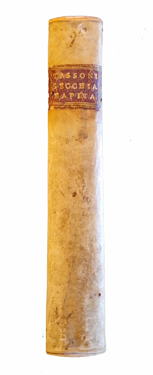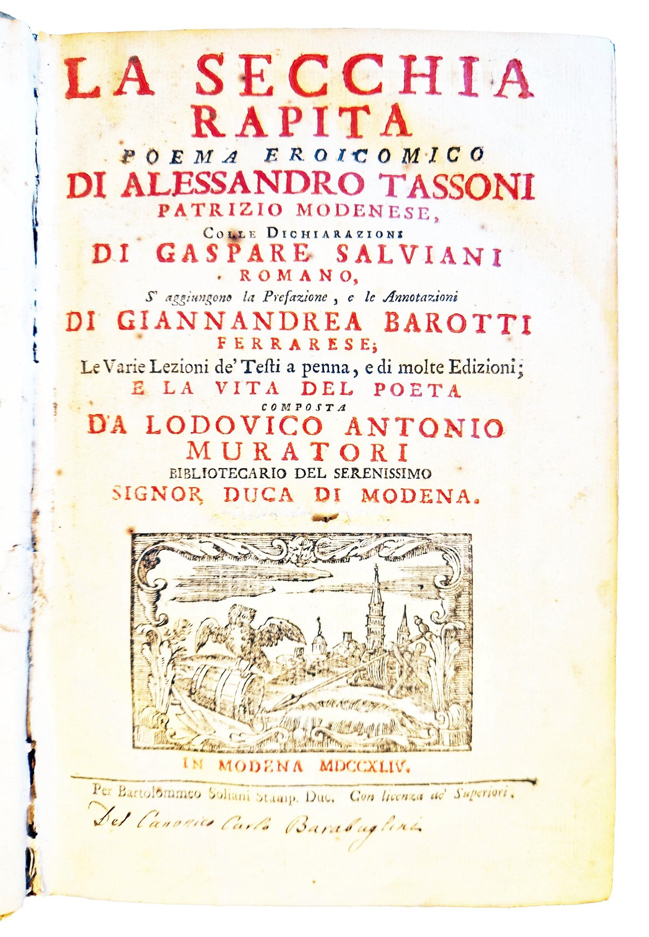 in-8°, 210x136 mm, leg. coeva rigida in mezza pergamena con angoli, carta decorata ai piatti, titolo a cartteri dorati su tassello in pelle al dorso, tagli spruzzati di rosso e verde; pp. [4], 508, [3] c. di tav. rip. Antiporta calcografica. Frontespizio a caratteri rossi e neri, con grande vignetta (civetta sulla secchia con Modena sullo sfondo). Iniziali, fregi, finali ed illustrazioni calcografiche. Una tavola xilografica all'inizio di ognuno dei 12 canti. Numerose tavole calcografiche (5) nel testo illustranti a piena pagina la "Torre di marmo bianco alta braccia di Modena CLXIV once VIII" (prima del secondo canto, del quinto, del decimo, dell'undicesimo e del dodicesimo). Marca (Bacchetta del rabdomante con le iniziali BS intrecciate e motto in greco: Ariston hydor) a c. 2G7r (p. 477 din fono al canto in-12°). Opera comprendente: la prefazione, un catalogo delle edizioni della secchia, la vita del Tassoni a cura del Muratori, preceduta da un suo ritratto a piena pagina, una appendice, varie riflessioni, il testo della secchia rapita, suddiviso in 12 canti, ognuno preceduto da illustrazione a piena pagina, il testo del canto dell'oceano dello stesso autore e gli indici. Dopo p. 98 una tavola ripiegata: "Tavola genealogica de' personaggi della casa Tassoni di Modena". Dopo p. 122 una tavola ripiegata: "Mostra del carattere di Alessandro Tassoni … ". Dopo p. 476 una tavola ripiegata: "Spezie, o mostra del carattere di Alessandro Tassoni …". Prov.: antica iscrizione manoscritta a penna in fondo al frontespizio ("del canonico Carlo Barabuglini" - collaboratore nella redazione del testo "Notificazione. D'ordine dell'Illmi Signori Confaloniere, e Priori residenti della Terra di Monte, territorio qualmente in avvenire …", pubblicato nel 1742). Rif.: IT\ICCU\UBOE\022858 (variante C). OCLC, 1403609795. Cond.: Tracce d'uso alla legatura (leggere abrasioni ai margini delle carte). Carte pulite ma con presenza di fioriture. Abrasione al frontespizio, con leggera mancanza di carta (cancellatura di vecchia iscrizione d'appartenenza). Esemplare nel complesso molto buono.