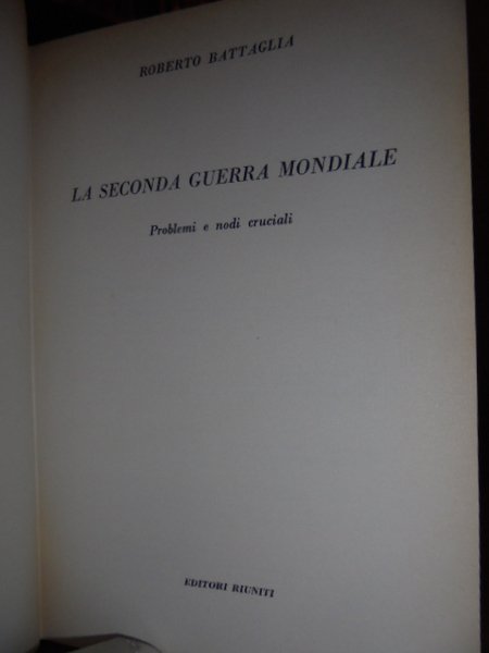 Roberto, Battaglia. Bologna, Editori Riuniti, 1961. La seconda guerra mondiale. Problemi e nodi cruciali. In-8°, tela edito con titolo in oro al dorso (manca la sovracopertina). 452 pp. con numerose tavole in bianco e nero fuori testo. In buono stato di conservazione. Neg. storia sotto.